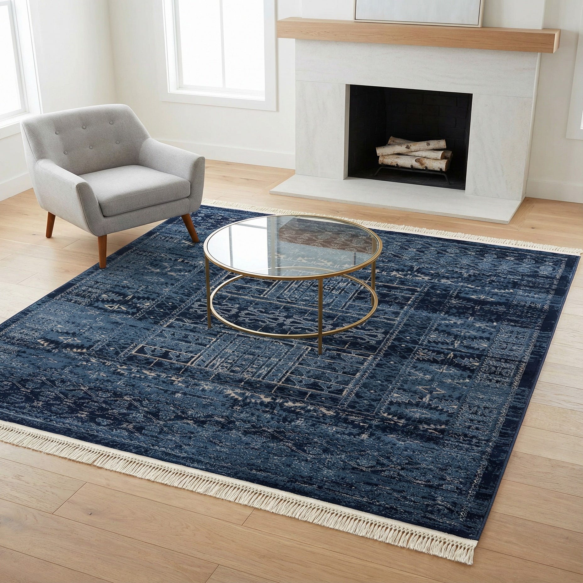 Machine made from 100% polypropylene, the rug has a low, dense pile that feels soft underfoot with a slight, low-profile sheen. Its colorway—blue ground with navy contrast and ivory detailing—makes it well-suited to a range of interiors. Place it beneath a compact seating group or coffee table to anchor a living room, layer it at the foot of a bed for added depth in a bedroom, or use it to bring color and pattern to a study or home office with warm wood tones. It also complements contemporary and transitional decor, pairing nicely with neutral upholstery, brass or matte-black accents, and linen or leather textures.