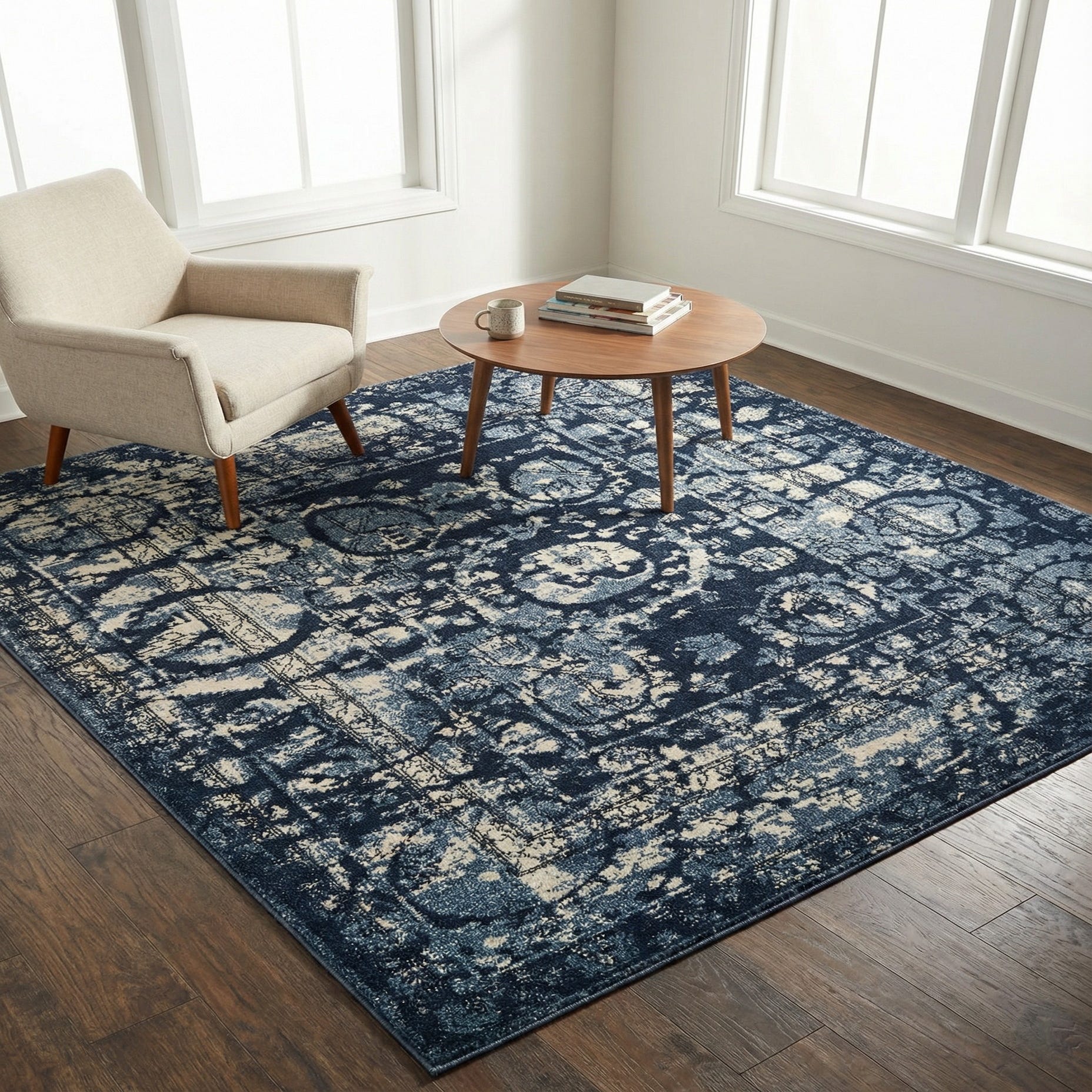 Machine-made of 100% polypropylene, the rug has a low-profile pile with a soft, slightly dense hand that feels comfortable underfoot while keeping the pattern crisp. The blue palette pairs naturally with coastal, transitional, or modern-farmhouse schemes — try it with whitewashed wood and linen upholstery for a relaxed coastal feel, charcoal leather and brass accents for a more tailored living room, or layered under a small seating group or home office desk to define the space and add color without overwhelming.