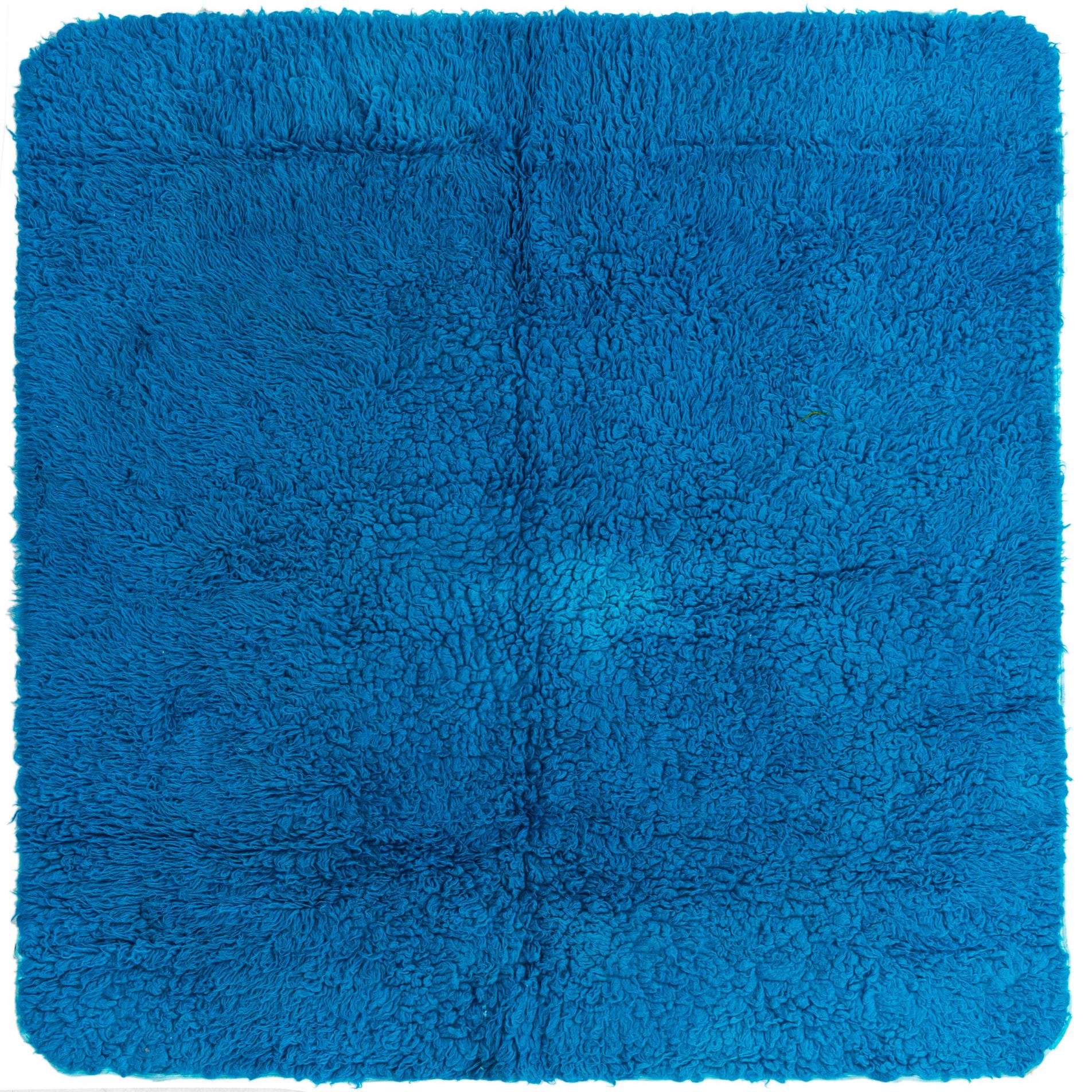 A plush, square 5' 7 x 6' 0 blue shag rug with a textured, tribal-modern pattern, perfect for an indoor living space.