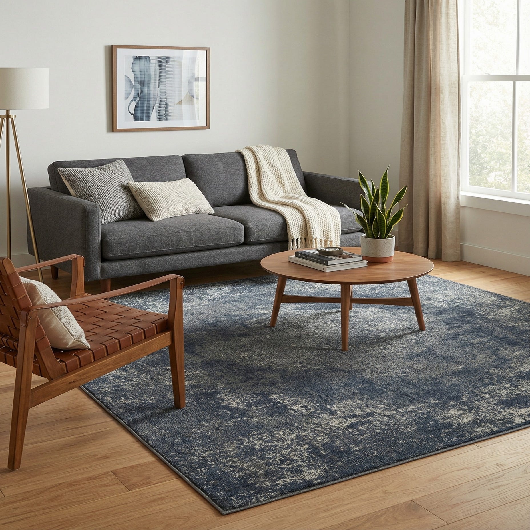 This rug fits well where a calm, grounded base is needed — place it beneath a sofa grouping in a contemporary living room, layer it under a bed for a serene bedroom palette, or use it in an entry or home office that needs a durable, low-maintenance foundation. Its muted colors and worn texture pair nicely with light wood or matte metal furniture and complement coastal, modern farmhouse, transitional, or industrial interiors.