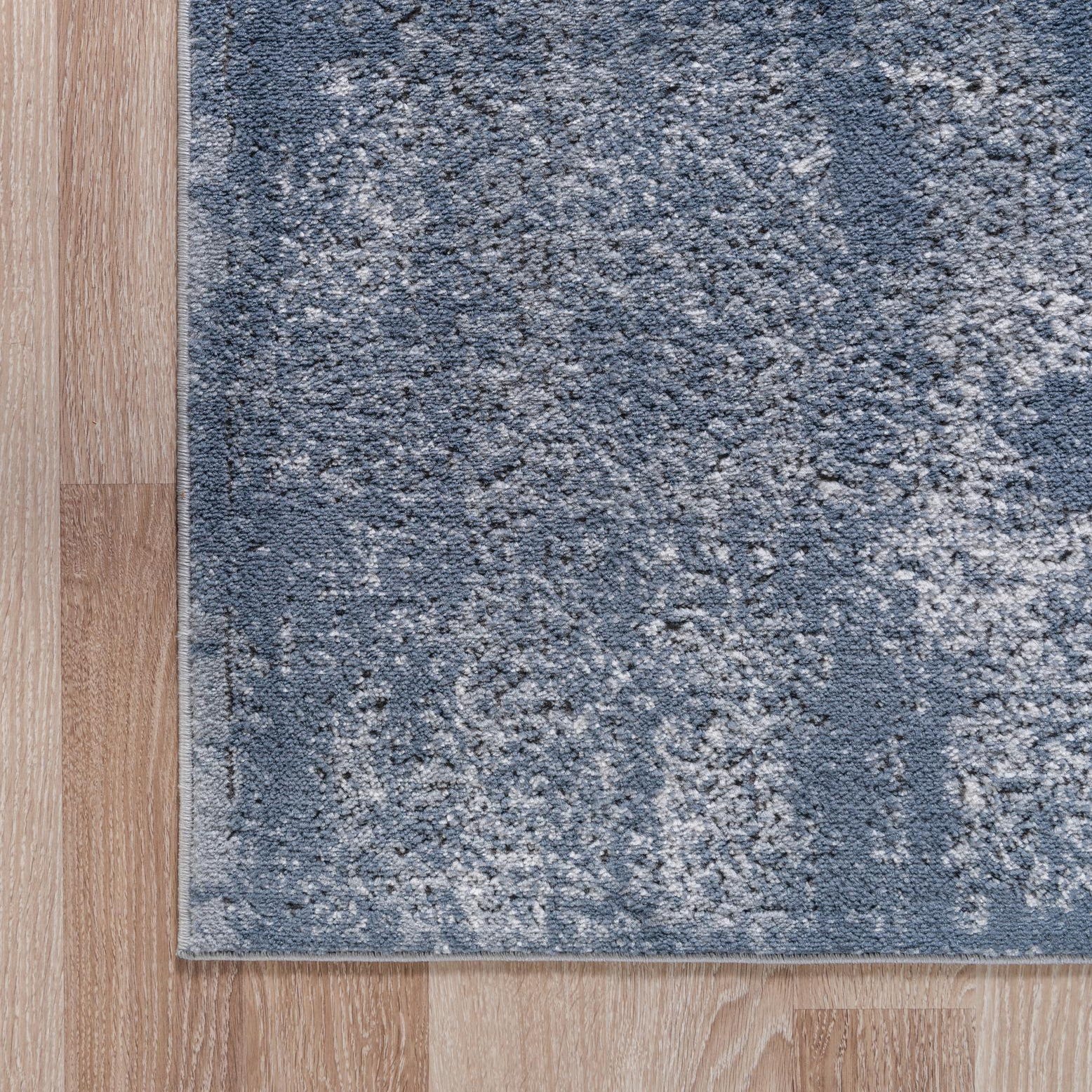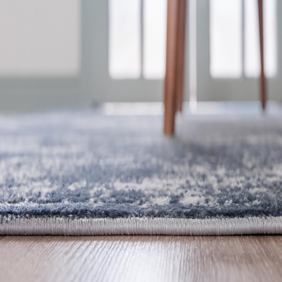 A softly distressed medallion pattern sits on a deep blue field, with gray and ivory speckling that creates layered visual texture and a lived-in, vintage-inspired look. Machine-made from 85% polypropylene and 15% polyester, the rug has a low-profile pile that feels smooth and slightly cushioned underfoot while maintaining a durable, easygoing surface. The blue background anchors the design while the gray and ivory highlights add subtle contrast and depth without overwhelming the room.