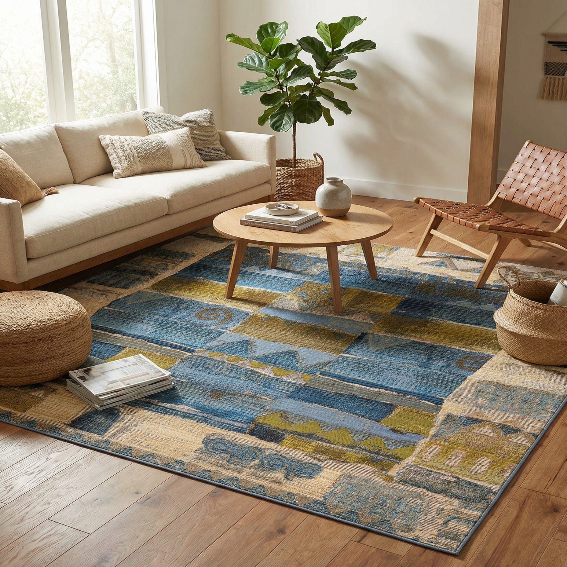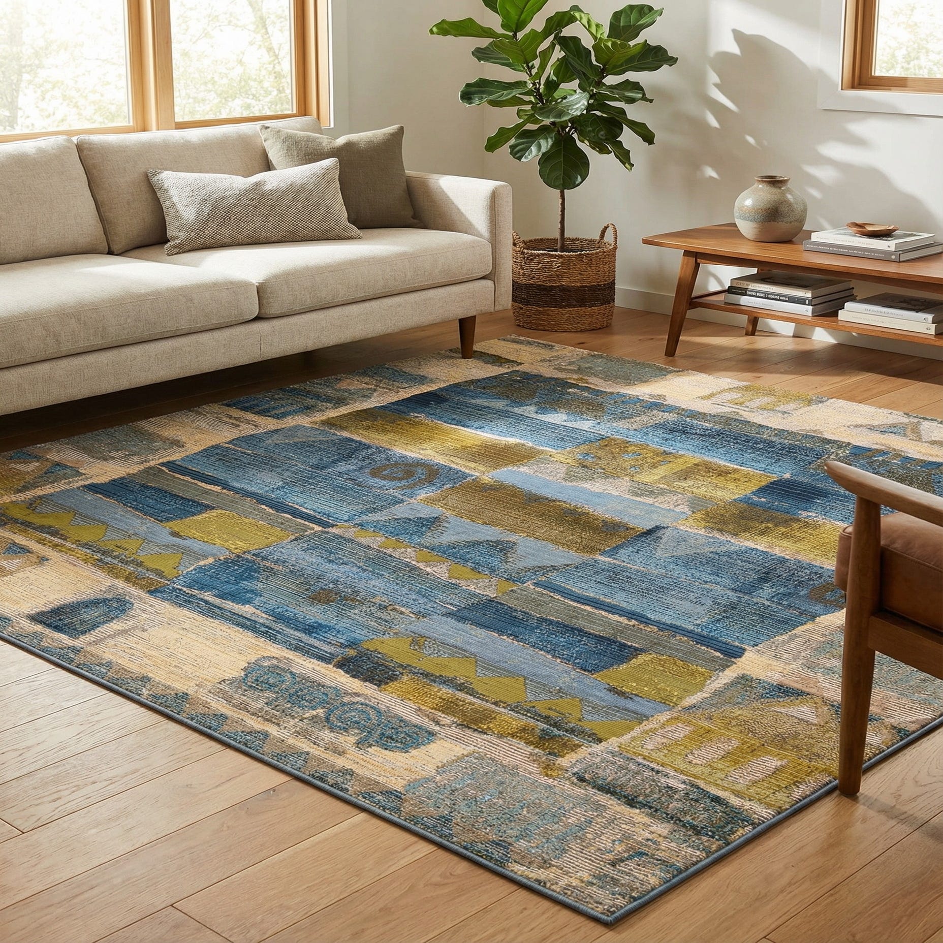 A layered patchwork of geometric and tribal motifs rests on a deep blue field, arranged in stacked bands and rectangles that create a balanced, modern composition. Triangles, scalloped arches and small spirals are rendered in warm beige, brown and cream with pops of olive that lift the palette. The surface is machine-made from 100% polypropylene, giving a low-profile, tightly woven face that feels slightly textured underfoot while remaining smooth to the touch.