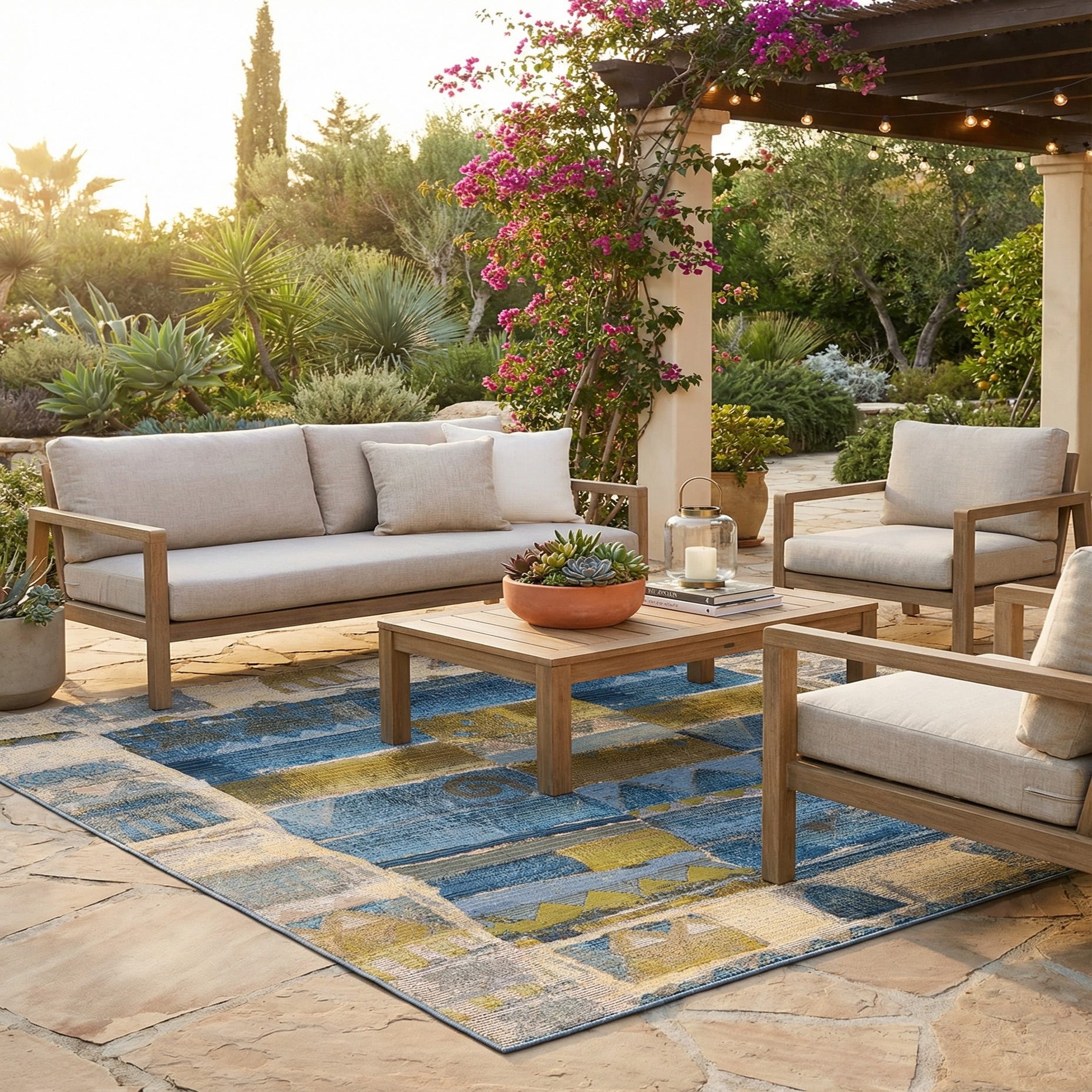 This rug suits both indoor and covered outdoor settings—place it on a covered patio beneath a teak dining set, anchor a sunroom seating group with neutral linen sofas and olive or mustard accent pillows, or add pattern to a transitional living room with rattan and metal furniture. Its modern-tribal look pairs well with warm woods, woven textures and matte black or brass hardware for a relaxed, layered aesthetic.