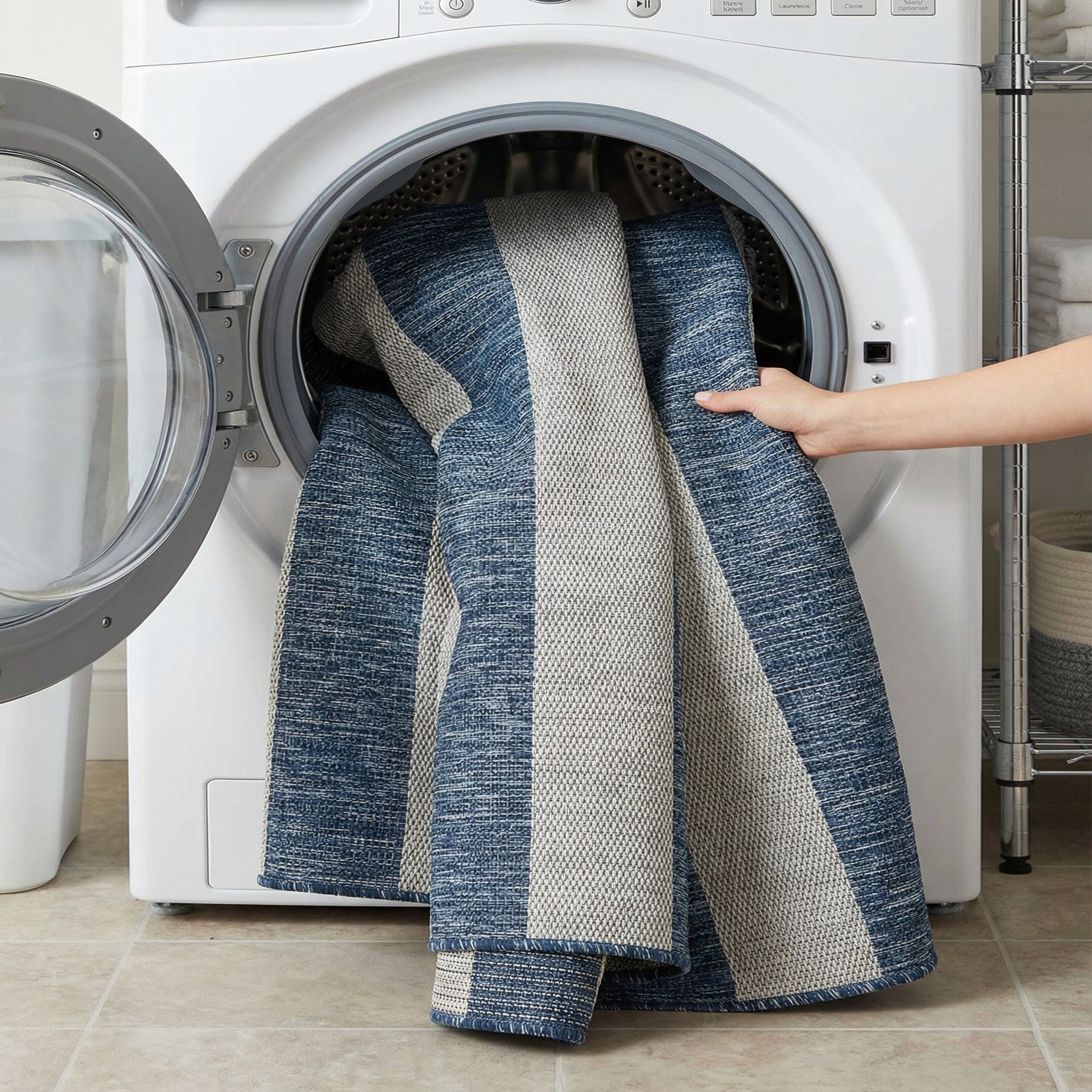 Machine made of 100% polypropylene, this rug brings durable, easygoing style to outdoor and transitional indoor spaces. It works well on a covered patio or porch, under a casual dining table, or layered in a sunroom; pair it with natural wood furniture, navy and white linens, wicker seating, or gray metal accents for a coastal, modern, or coastal-modern aesthetic. The graphic stripe provides a strong visual anchor without overwhelming other decor elements.