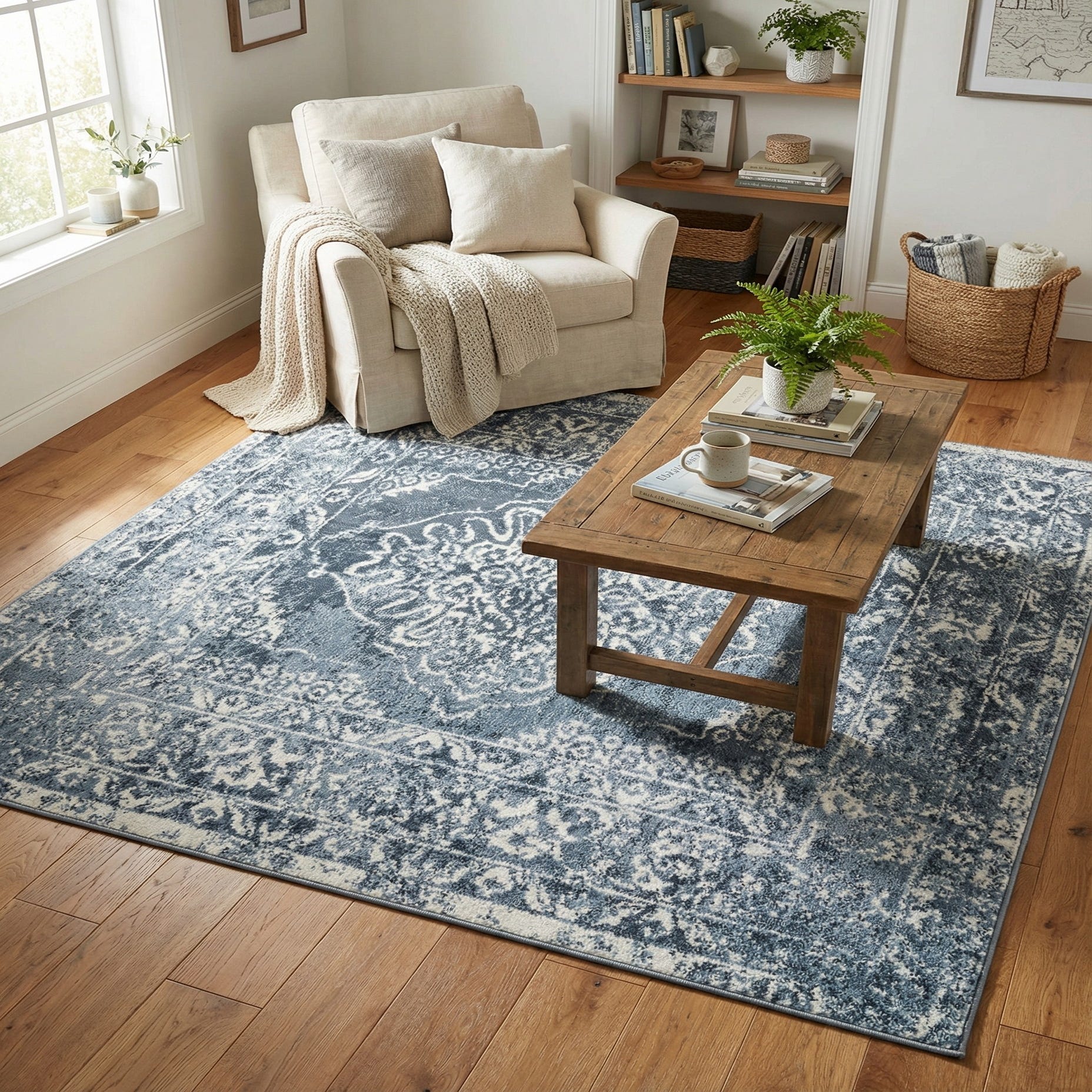 This rug works well in transitional and coastal interiors where a muted palette and vintage detail are welcome. Place it beneath a coffee table to anchor a living area, layer it under a bed to add subtle pattern to a bedroom, or pair it with light woods, navy accents, and crisp linens for a pulled-together scheme. It also complements modern furnishings—glass or metal tables and streamlined sofas—when you want a softer, more textured foundation for the room.