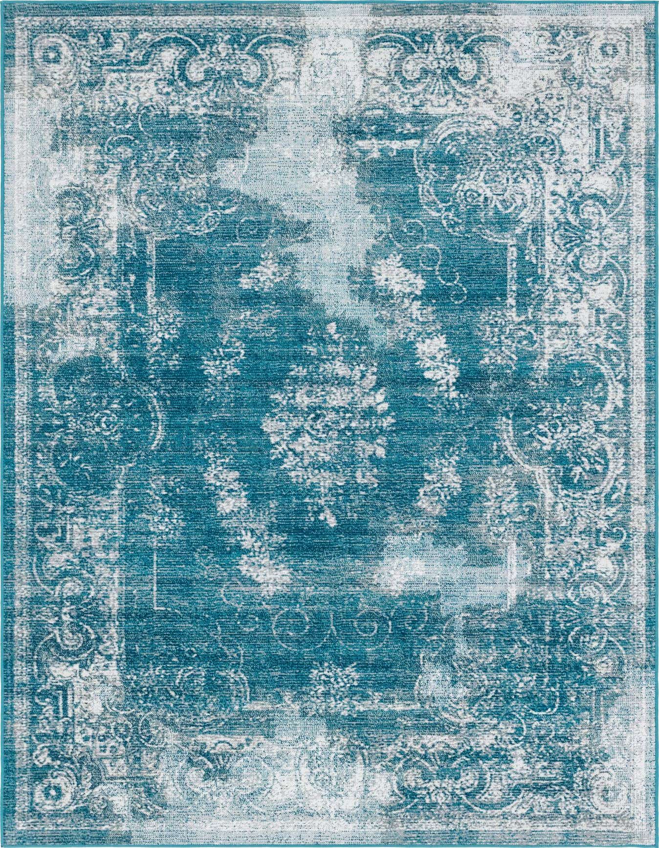 Primary color is Blue. Colors in this rug include: Blue, Gray, Ivory, Turquoise.