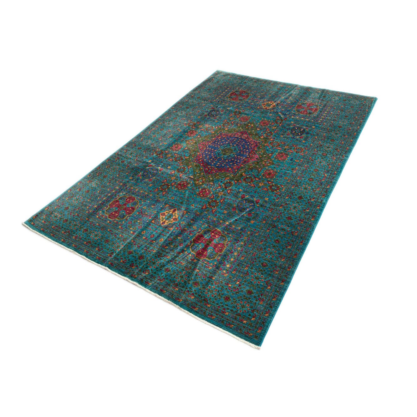 A 6x9 rectangular Amina Persian rug in shades of blue, featuring a vibrant central medallion and intricate floral patterns.