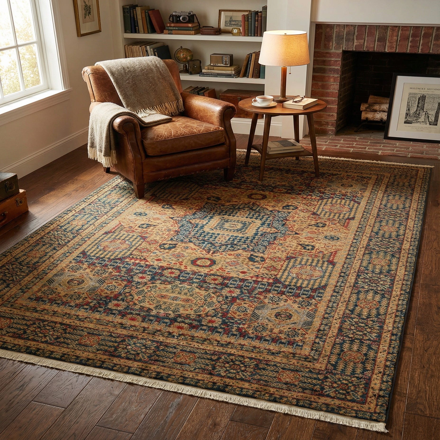 This rug pairs well with warm wood furniture and neutral upholstery, where the blue field can anchor a seating area and the tans and reds add visual warmth. Use it beneath a coffee table in a living room, to define a reading nook in a study, or under a dining table to introduce pattern without overwhelming the space. It also fits transitional or global-inspired interiors and complements brass or dark metal accents and indoor greenery for a layered, collected look.
