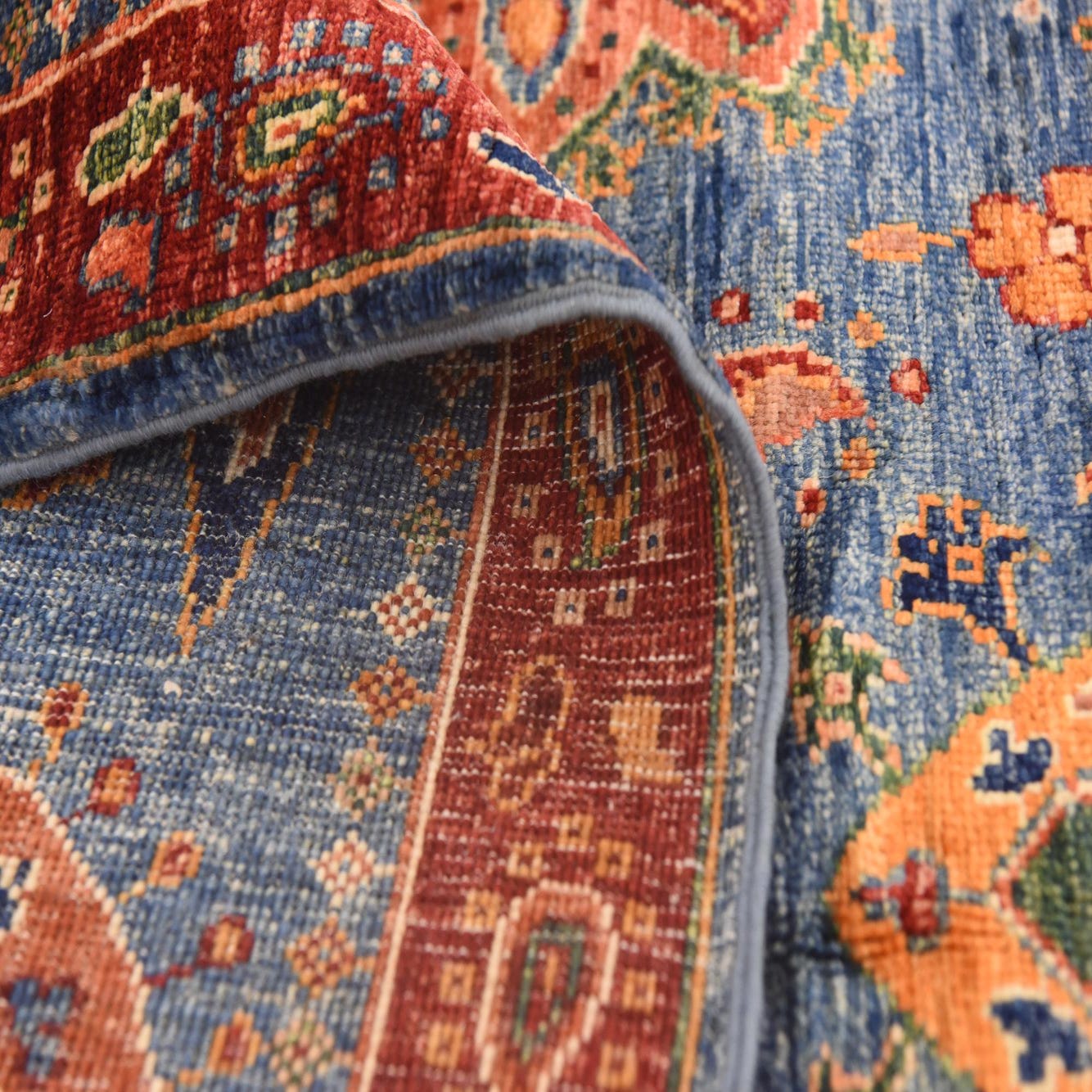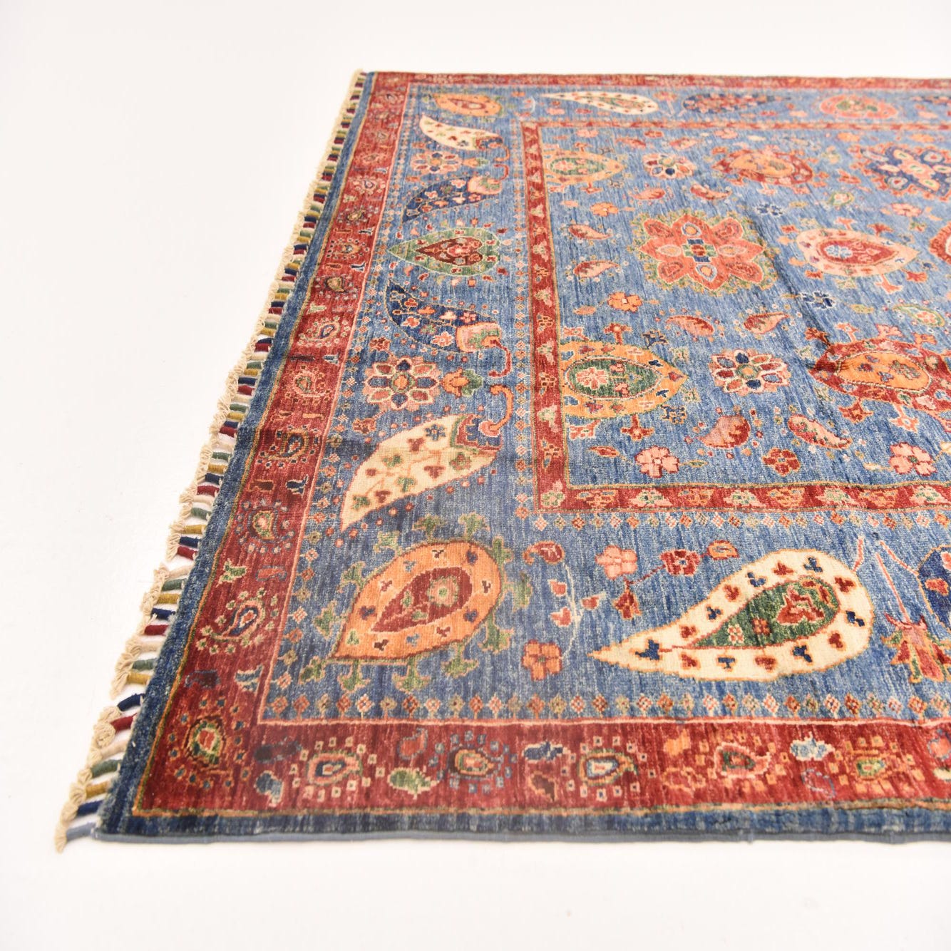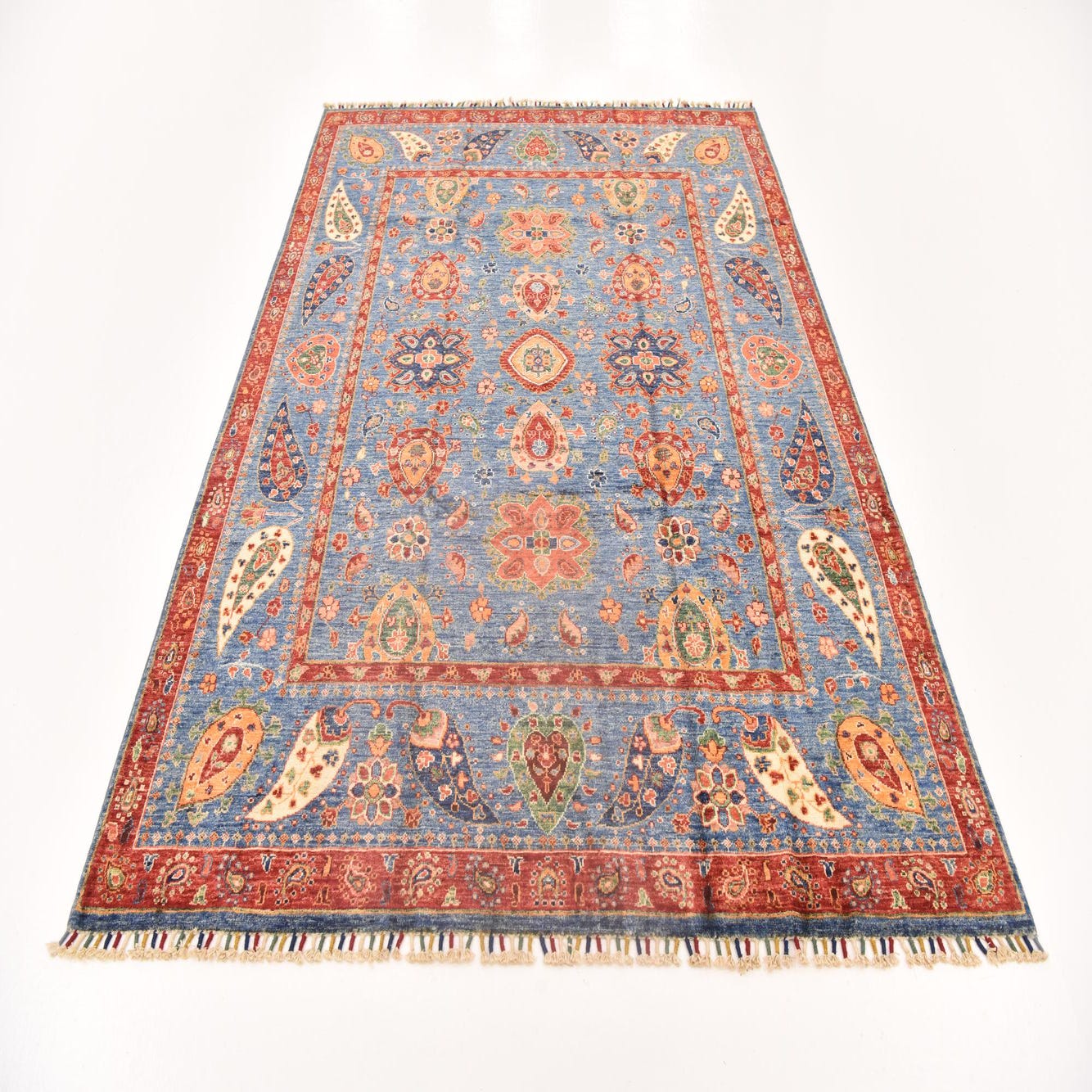 A 6x9 rectangular Ariana Ziegler rug featuring a traditional tribal pattern in various shades of blue and red, with intricate floral and paisley motifs.