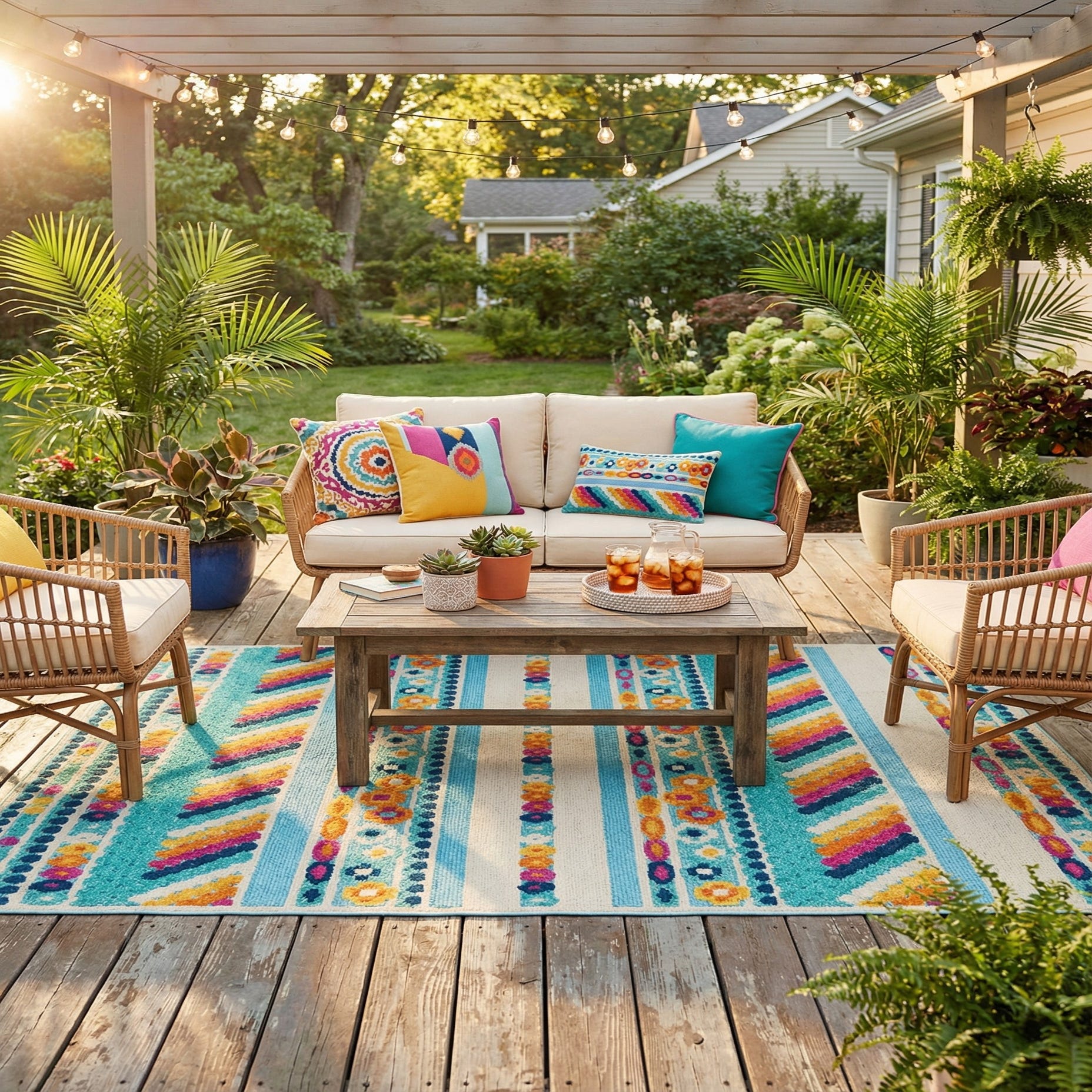 A 6x9 rectangular indoor/outdoor rug with a vibrant bohemian stripe pattern in blues, orange, pink, and yellow on a cream background.