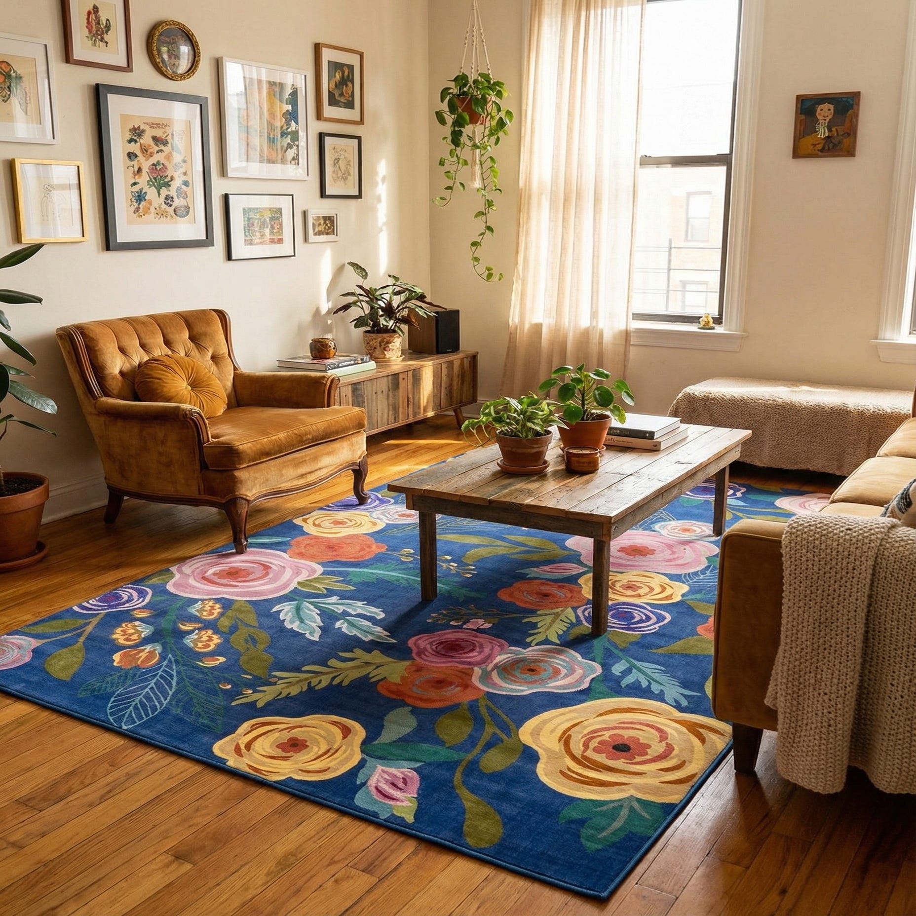 Machine-made of 100% polypropylene, the rug has a low-to-medium pile with a smooth, softly cushioned hand and a subtle sheen that picks up the brushstroke details. It works well as an anchor for a living room seating group—especially with neutral upholstery and wood furniture—adds a vibrant focal point to a bedroom, and brightens casual dining or sunroom settings. Pair it with brass or warm wood accents and throw pillows that echo the pink or yellow tones for a coordinated, layered look.