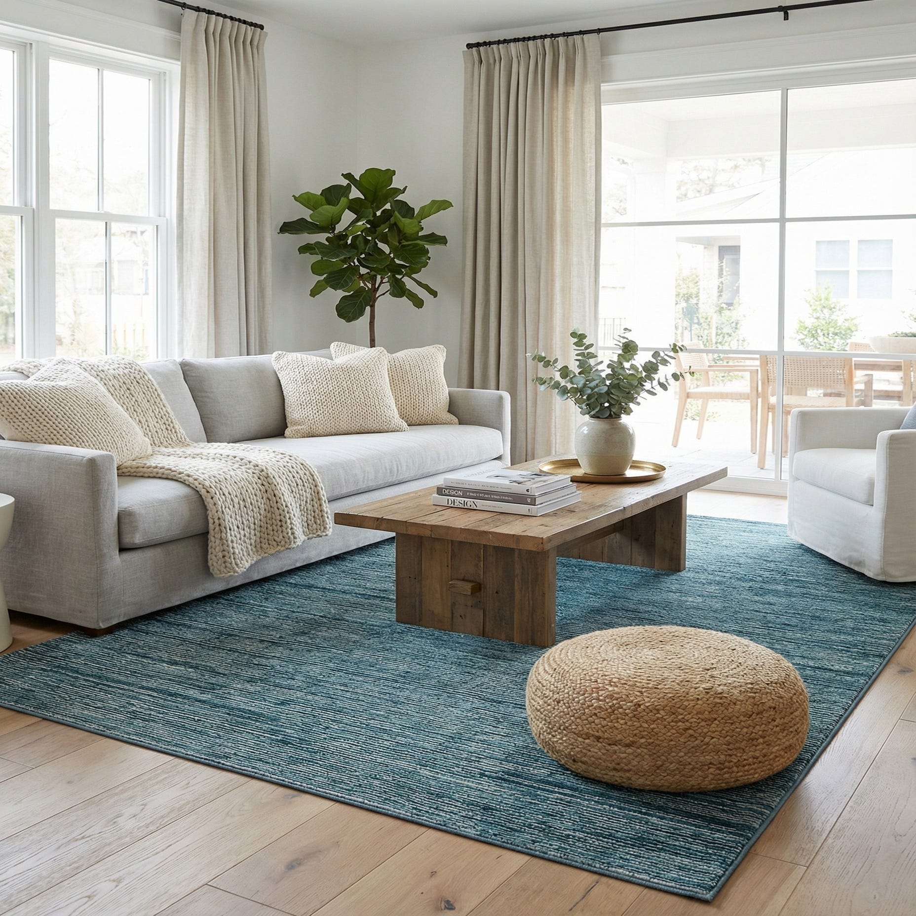 The stain-resistant and shed-free properties of the rug ensure both practicality and ease of maintenance, making it a convenient choice for everyday living spaces. With its serene blue tones, this rug can easily integrate into a variety of interior design schemes, from contemporary urban lofts to relaxed coastal living rooms or minimalist Scandinavian-inspired spaces. The Finsbury rug is a versatile piece that anchors furniture and complements a range of color palettes and decor styles while providing a plush underfoot experience.
