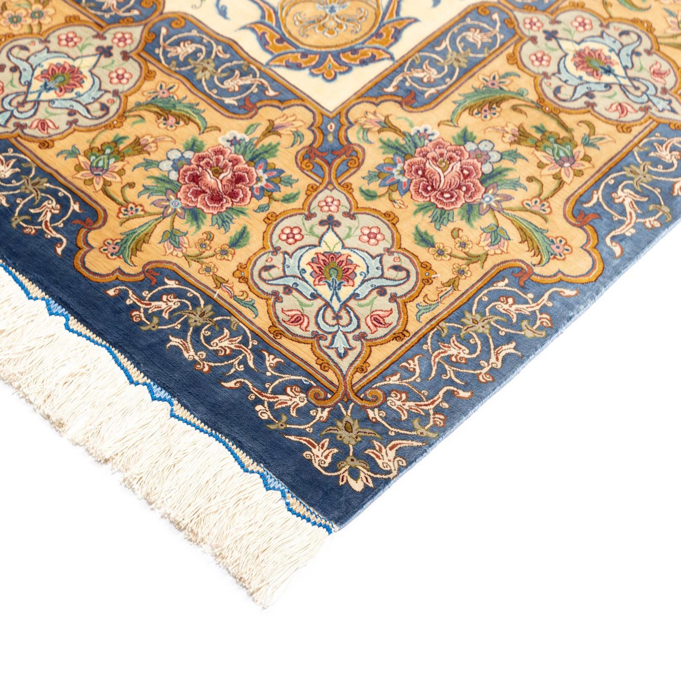 A 6x9 rectangular Ghom Silk Persian rug featuring a central blue medallion and intricate floral patterns in blue, gold, and red on a cream background, with a blue border.
