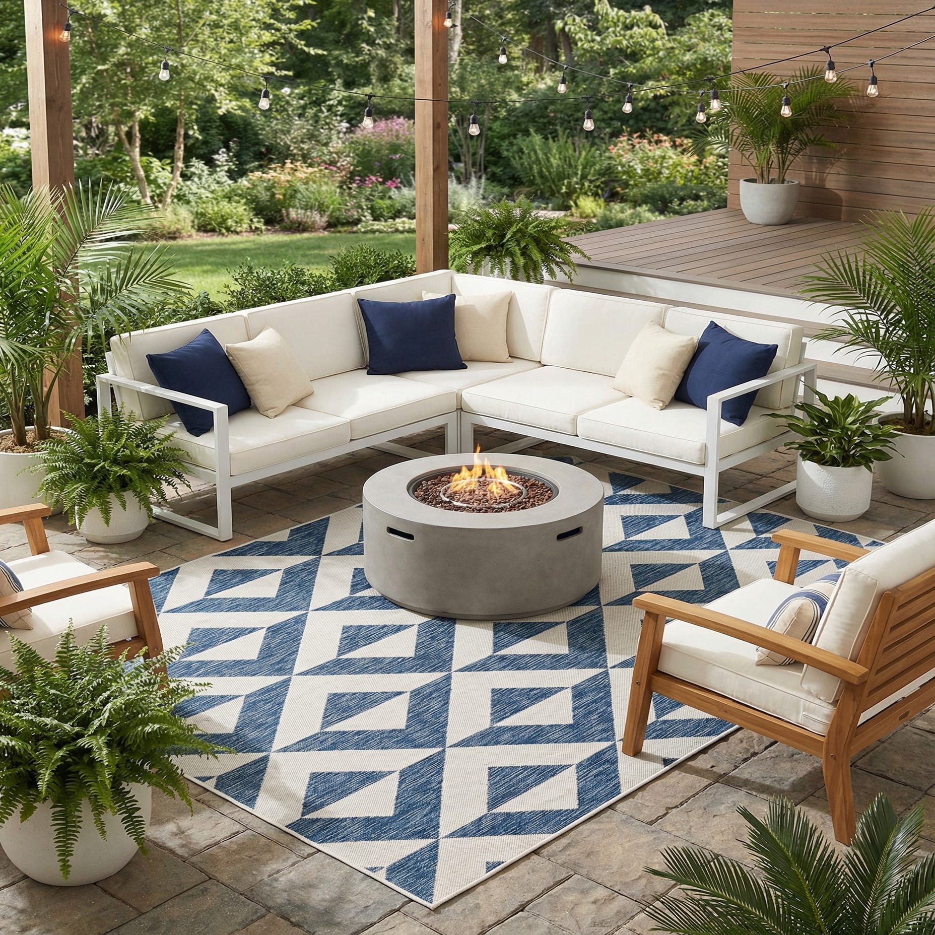 A 6x9 rectangular indoor/outdoor rug featuring a repeating geometric trellis pattern in textured blues and white.