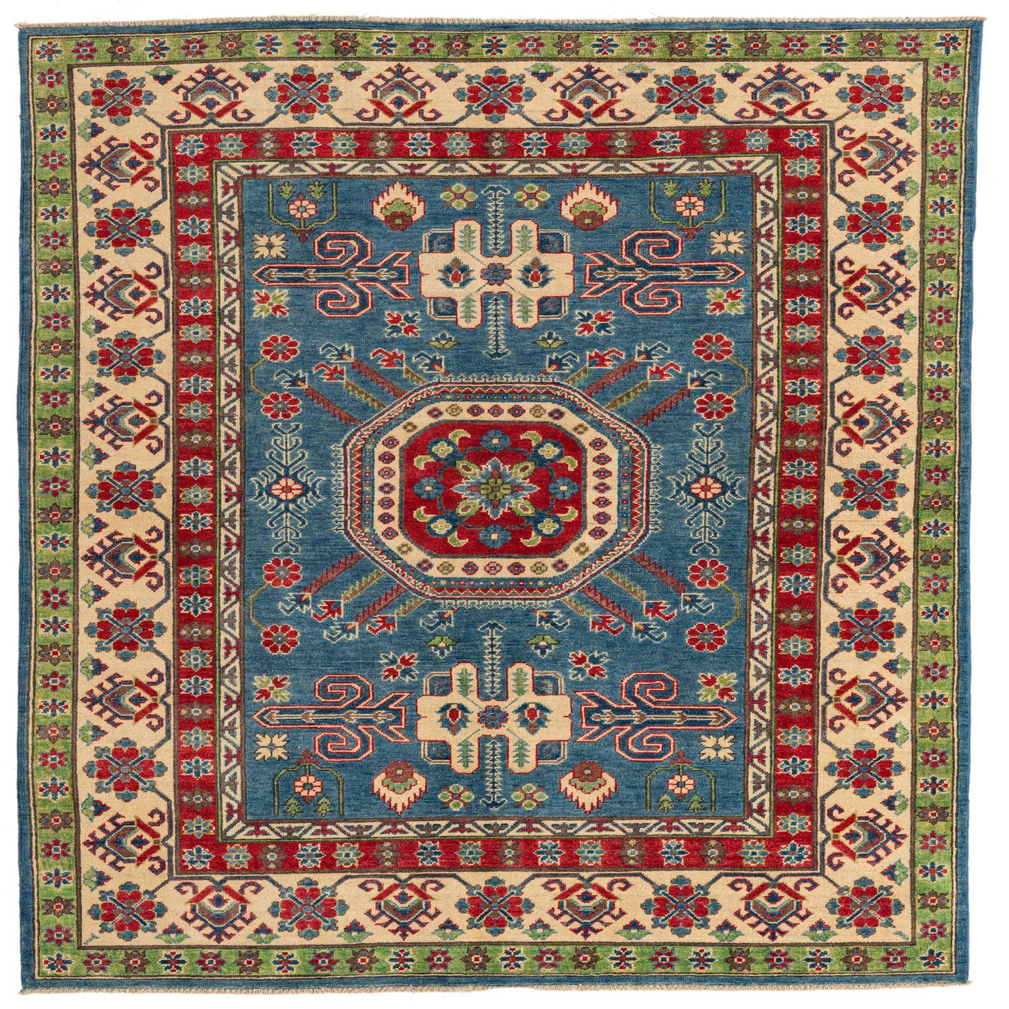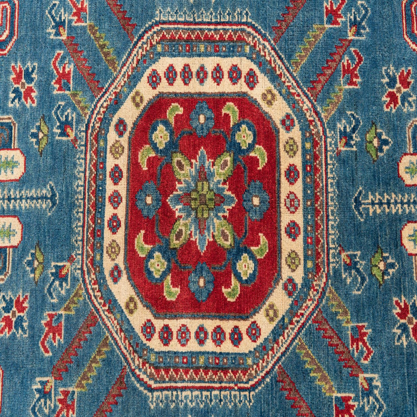 A 6x9 rectangular Kazak rug with a traditional medallion pattern in blues, reds, and creams.