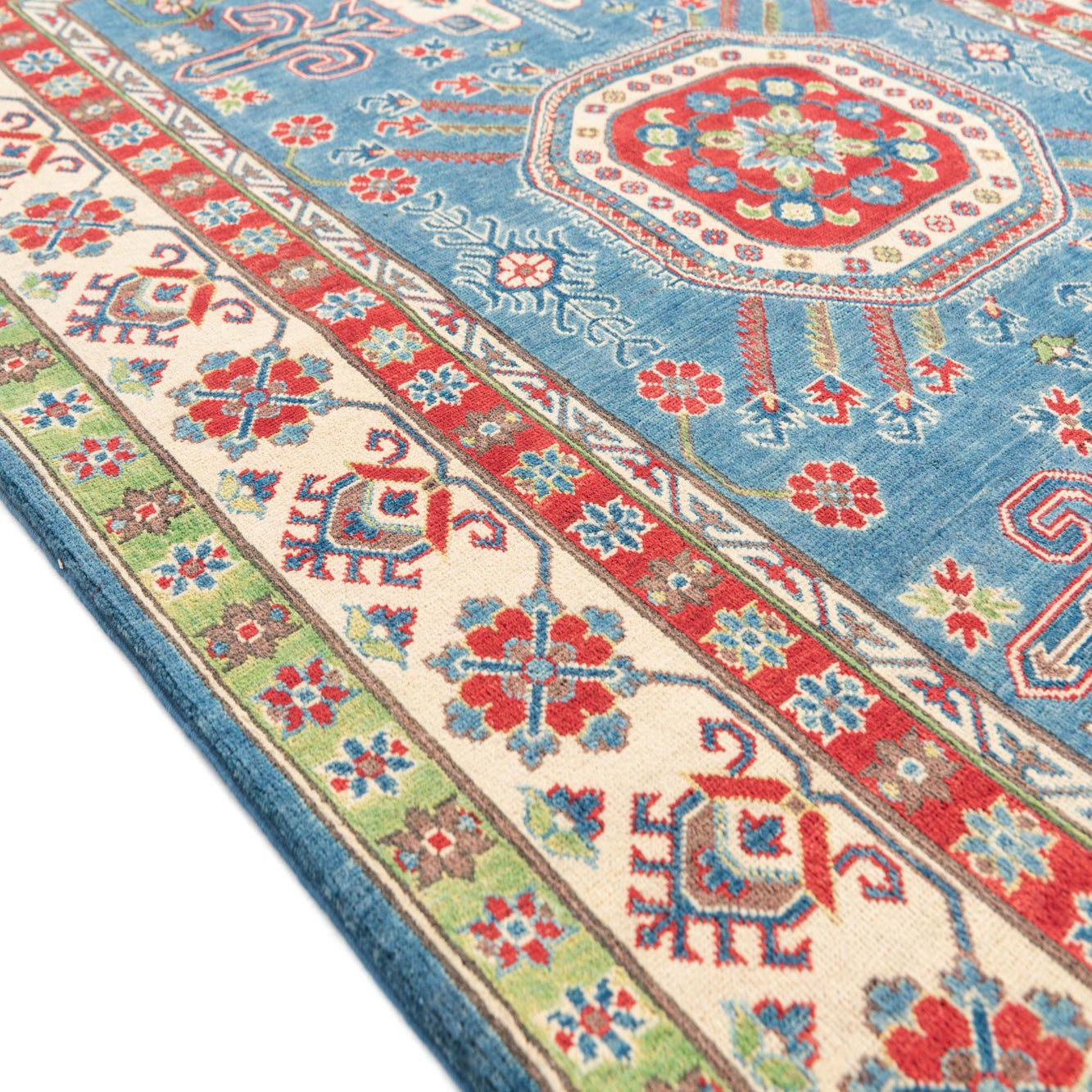 The Kazak collection rug is a handcrafted masterpiece, measuring 6x9 feet and meticulously hand-knotted from 100% hand-spun wool. This piece showcases a rich tapestry of cultural heritage with a vibrant blue background, complemented by intricate patterns in hues of brown, cream, green, and navy blue. The traditional design features geometric motifs and stylized foliate elements, creating a timeless aesthetic that can anchor a room with its bold yet balanced visuals.