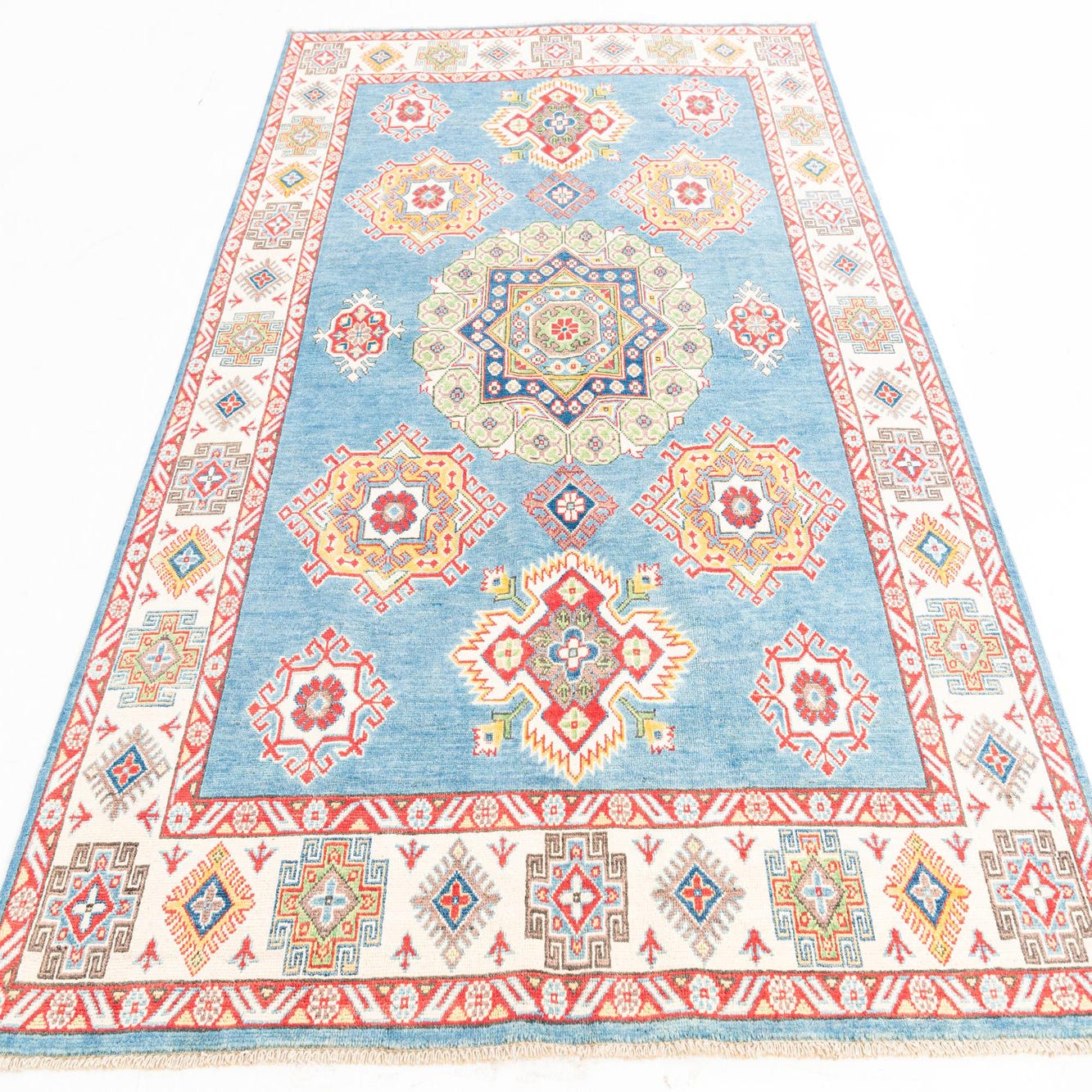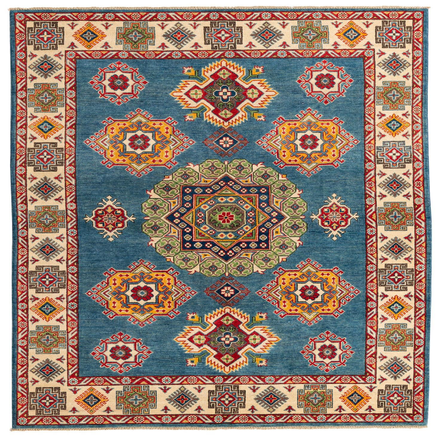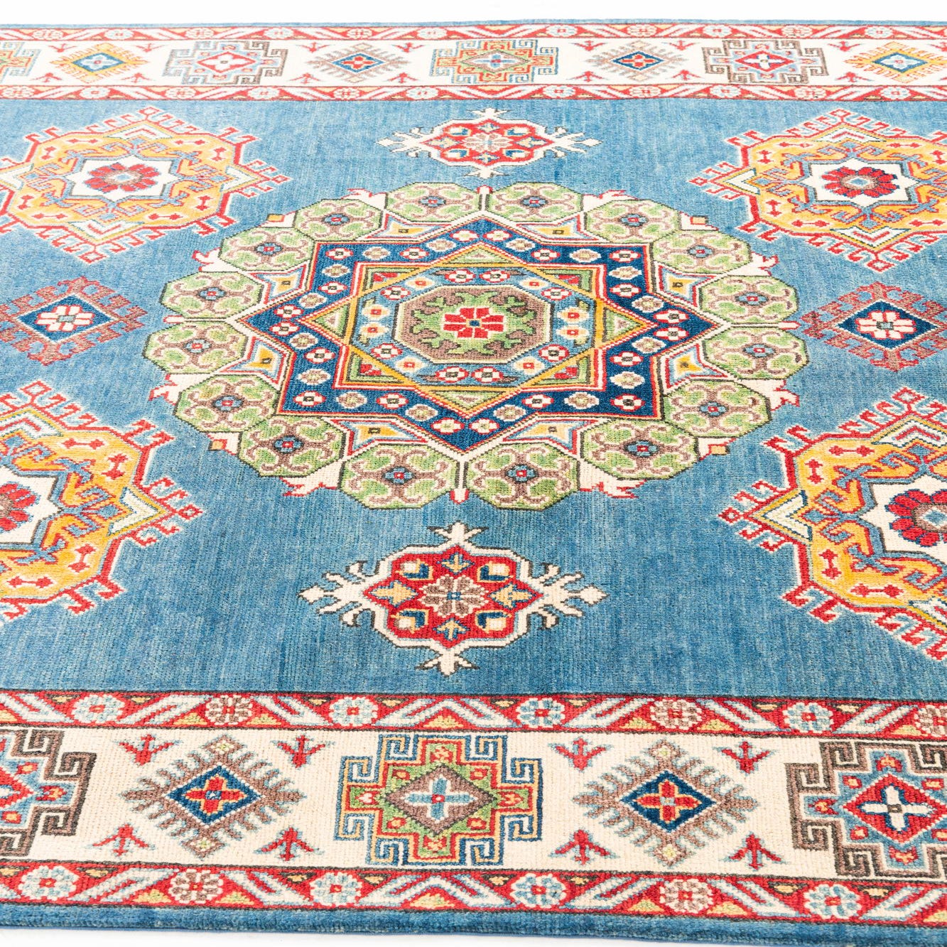The Kazak Collection presents a 6x9 hand-knotted rug crafted from 100% hand-spun wool, showcasing a rich blend of color and traditional design. The rug features a blue background that brings a tranquil foundation to its robust pattern. Emblazoned across the surface are symmetrical motifs in hues of ivory, yellow, red, and brown, accented by touches of green. These bold geometric shapes and intricate borders draw inspiration from age-old Kazak designs, which have been revered for their timeless appeal.