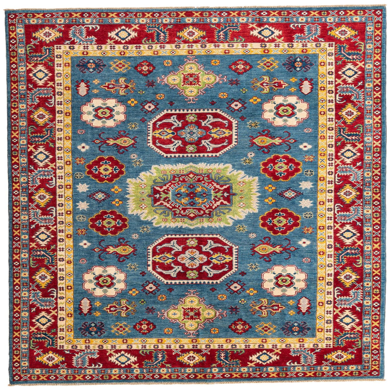 A 6x9 rectangular Kazak rug with a blue field, red border, and traditional Southwestern geometric patterns in red, yellow, and green.