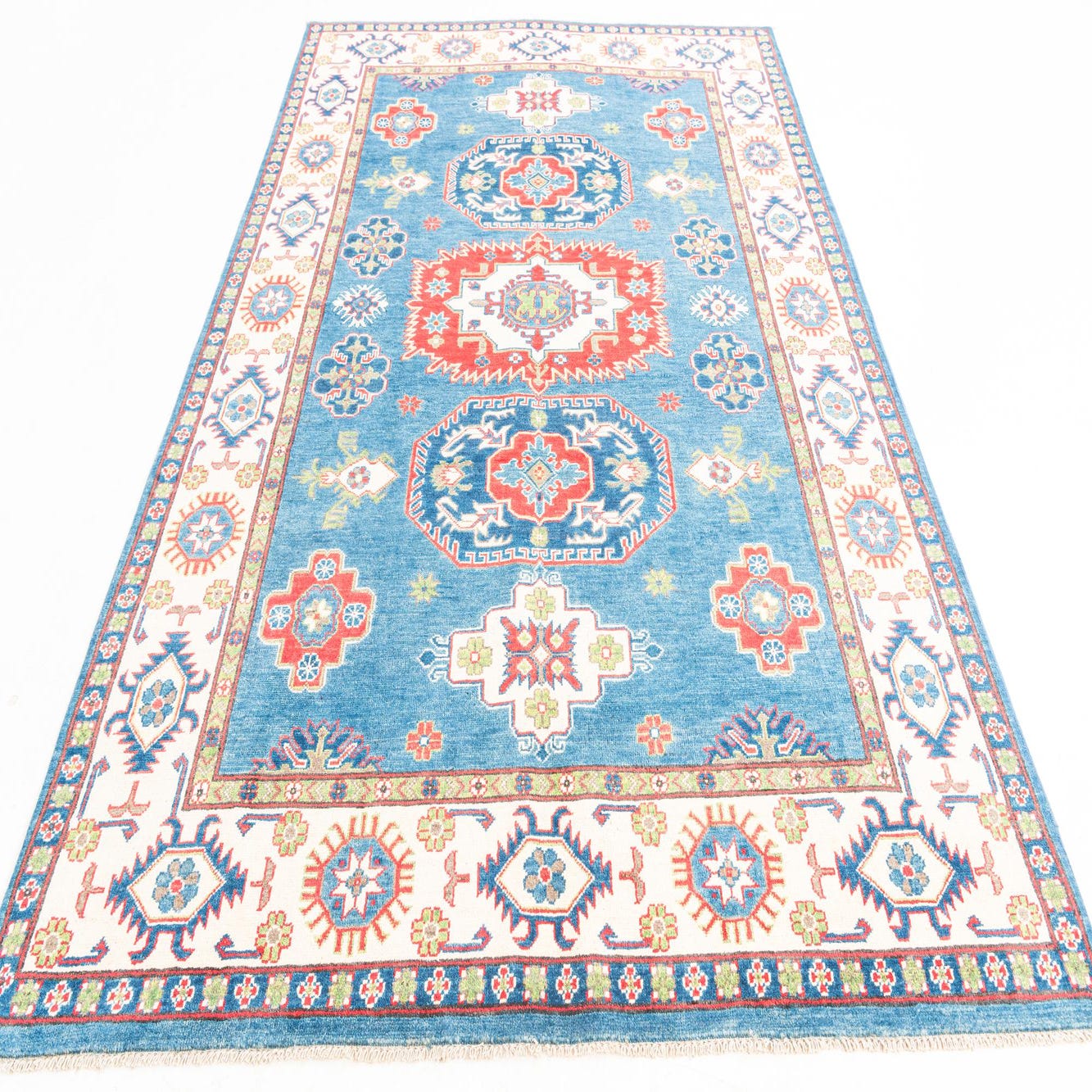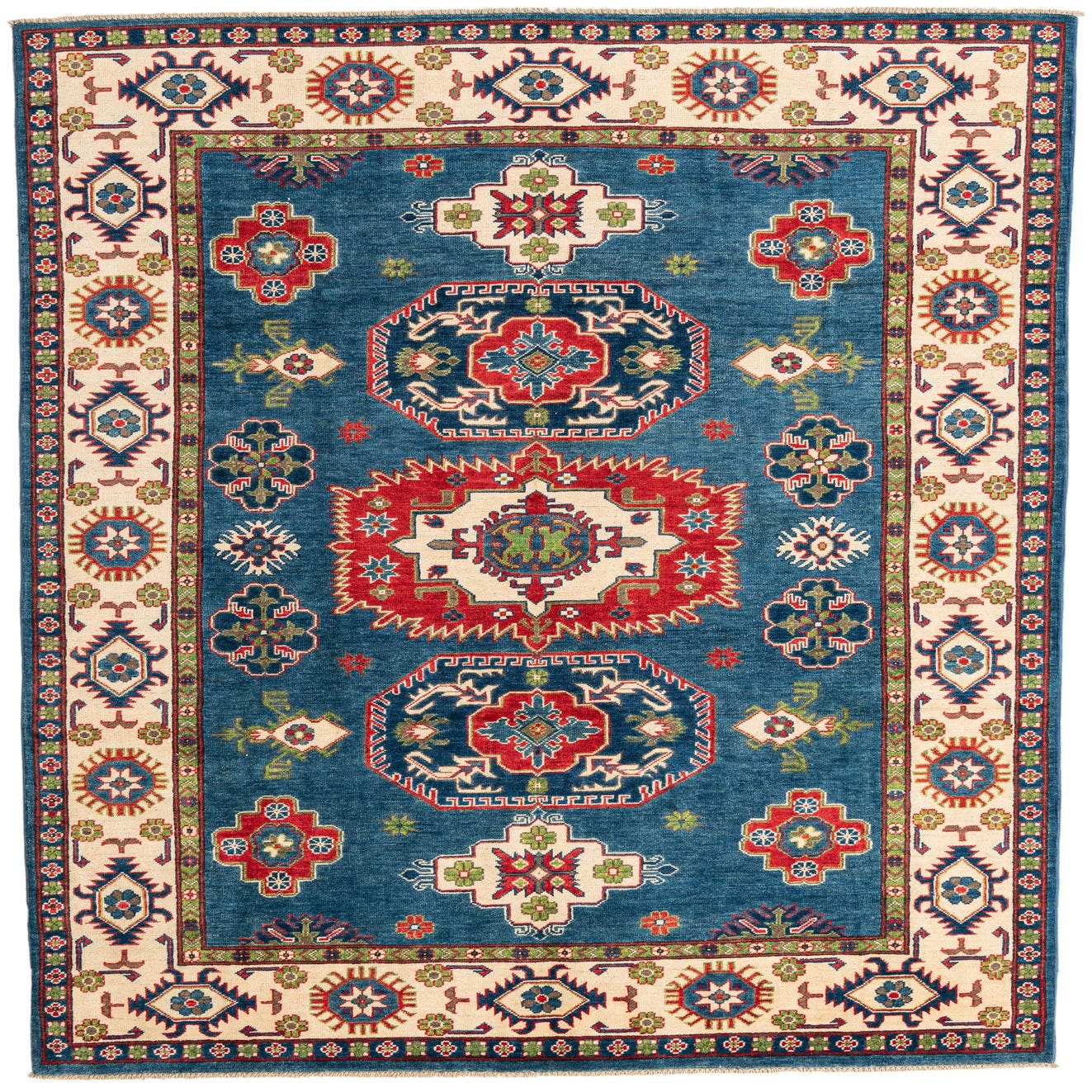 A 6x9 rectangular Rugs.com Kazak rug with a blue field and a cream border, featuring traditional Southwestern and Oriental medallion patterns in red, blue, and green.