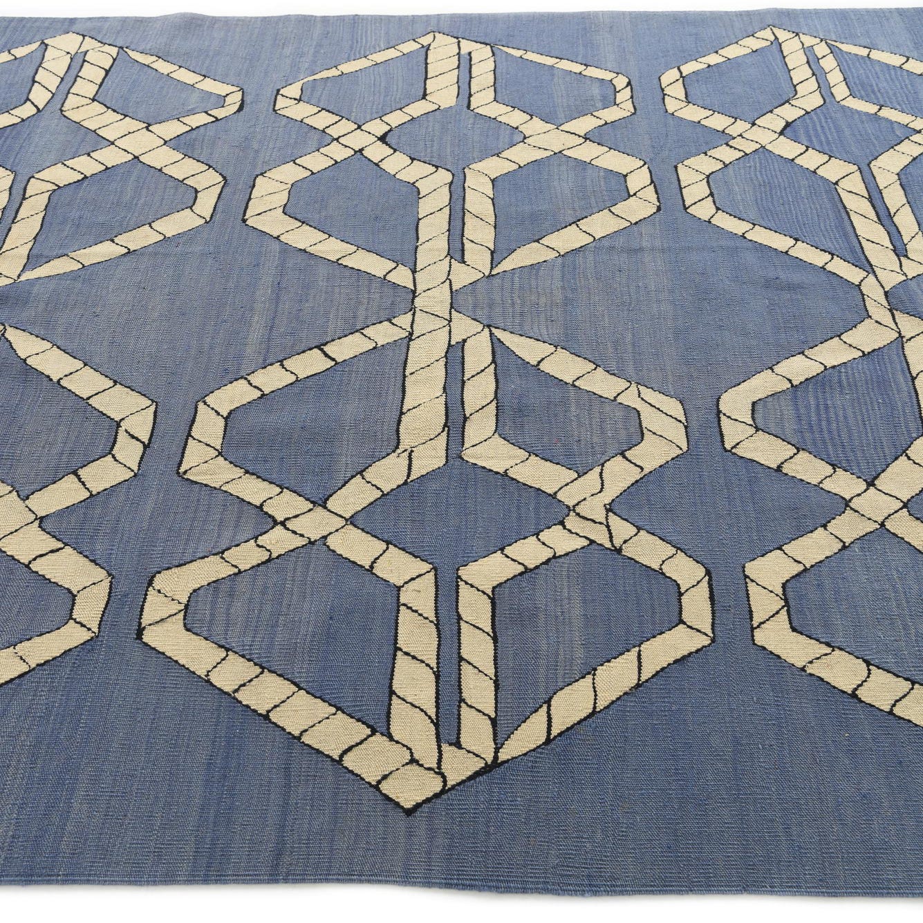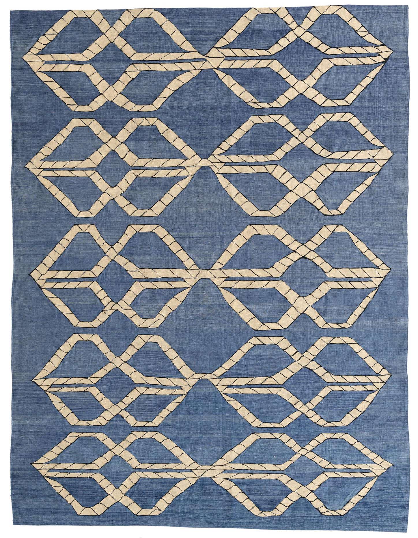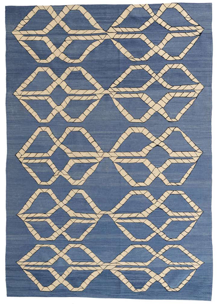 This 6x9 rug from the Kilim Modern collection is handwoven of 100% wool, ensuring a durable and soft texture that can withstand high-traffic areas. Its design features a contemporary geometric pattern with interlocking shapes in contrasting beige and black tones set against a soothing blue background, offering a visual statement with a modern appeal. The flatweave construction contributes to its sleek profile, making it a practical choice for rooms where door clearance is a consideration.