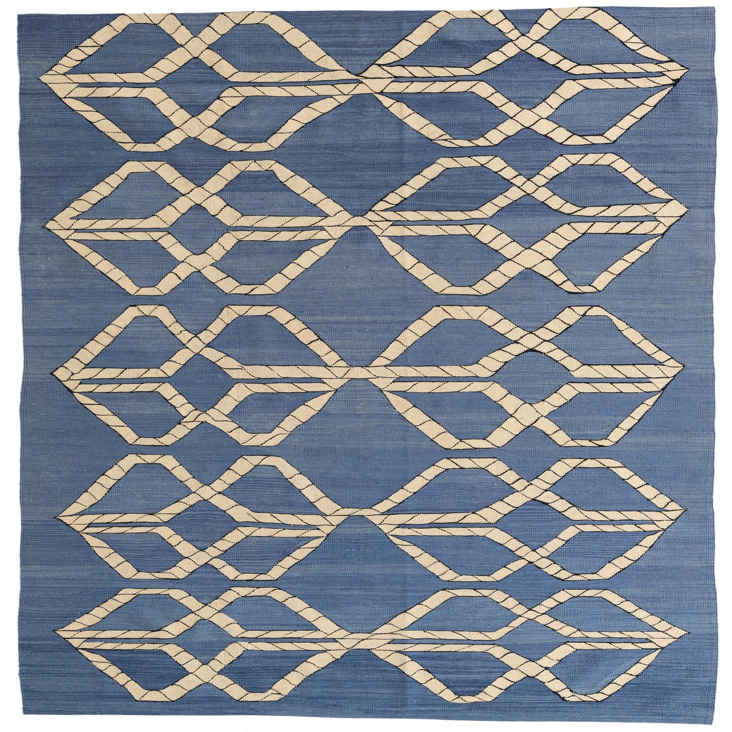 Primary color is Blue. Colors in this rug include: Blue, Black, Beige.