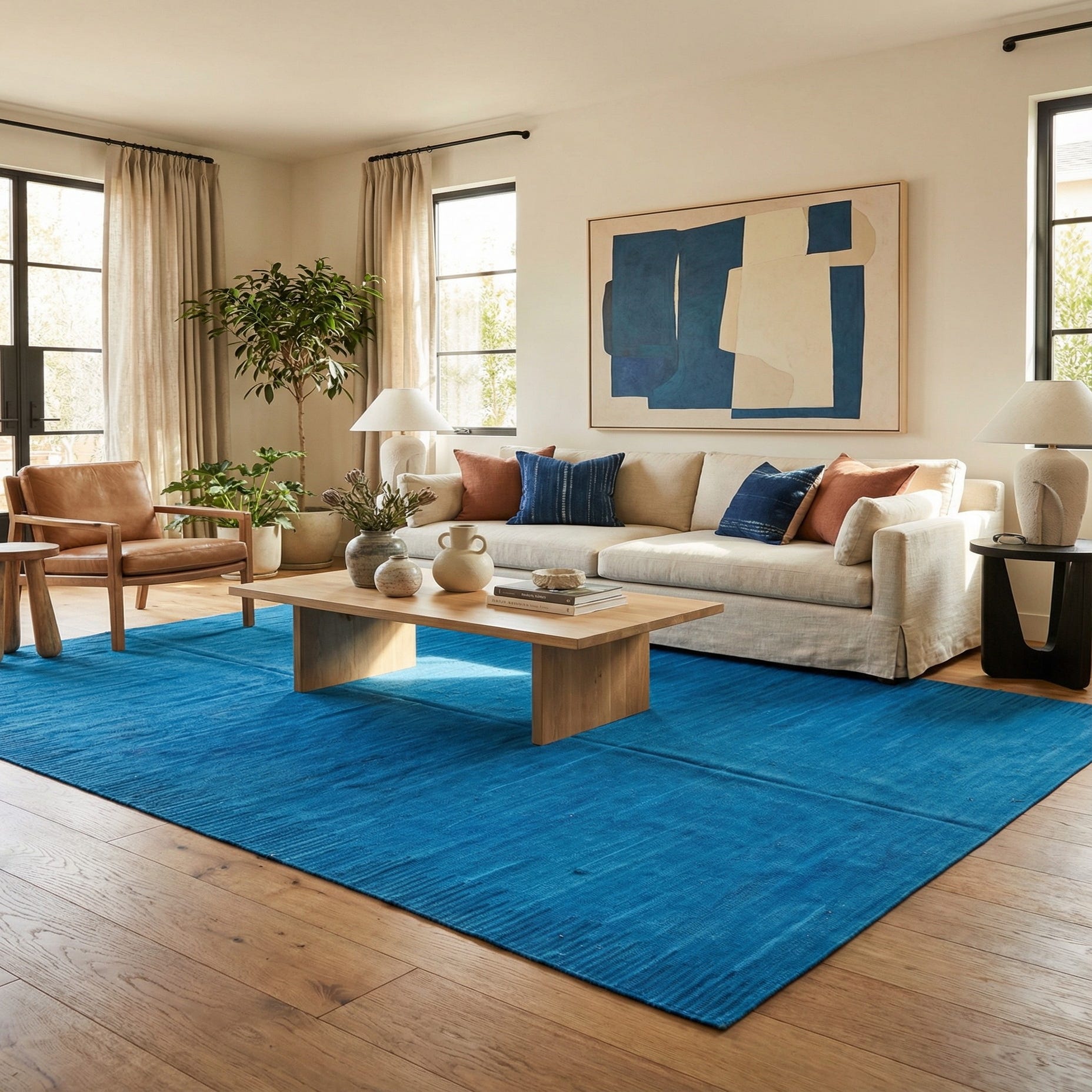 A 6x9 rectangular flatweave rug in a vibrant solid blue color, featuring subtle tribal patterns along the edges.