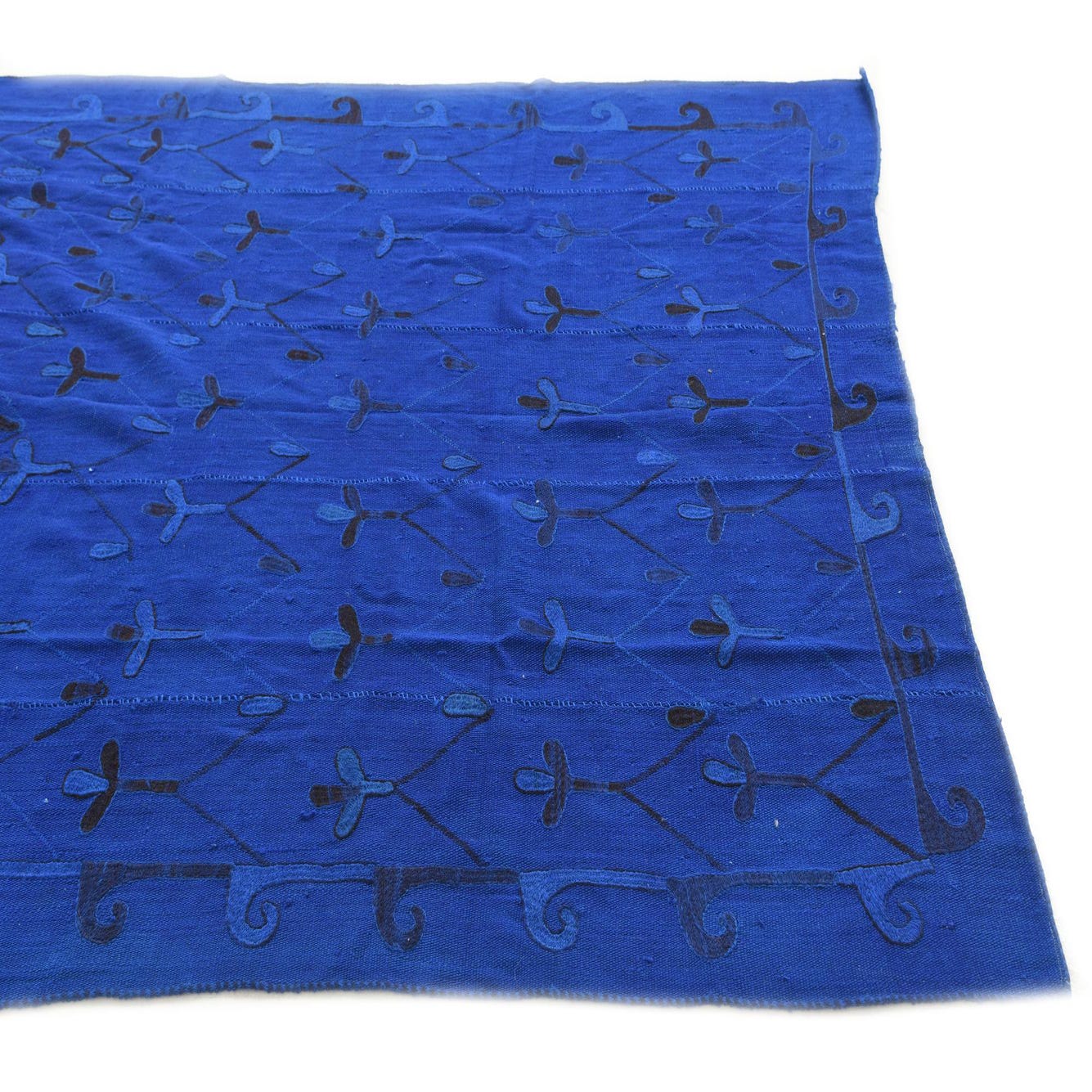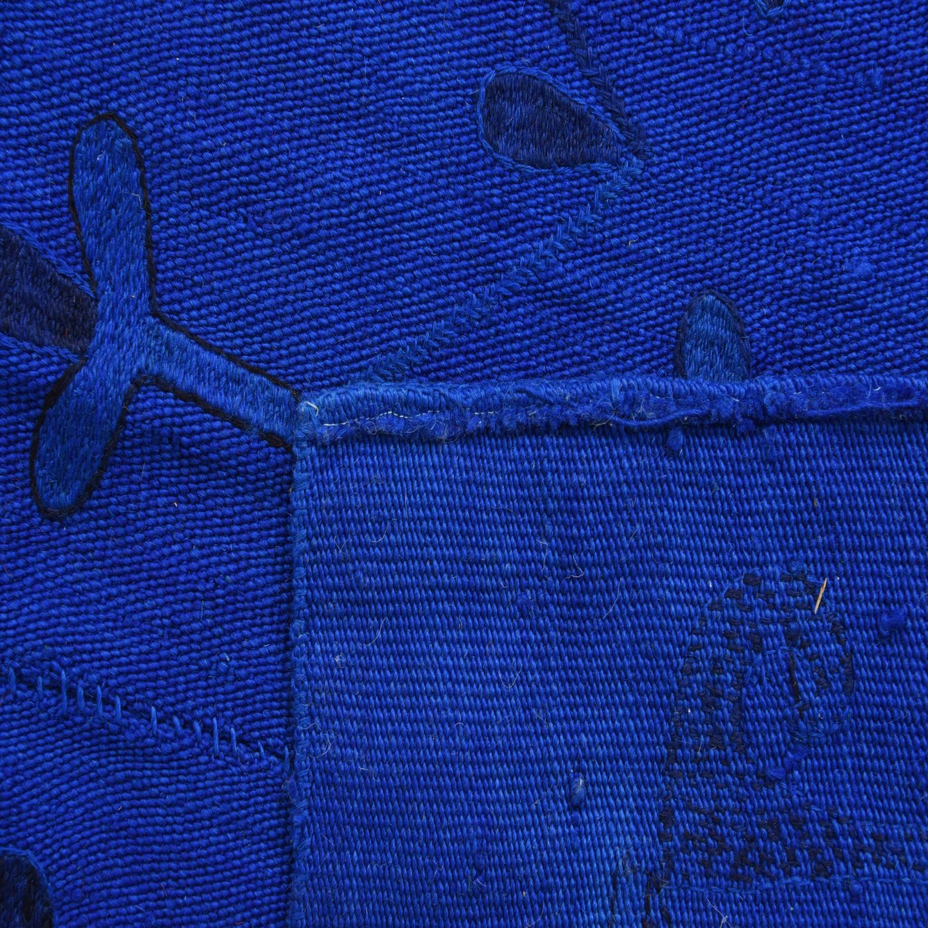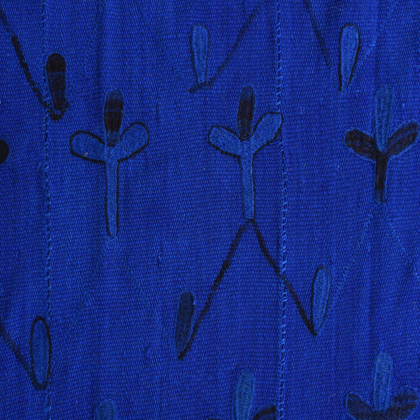 A saturated blue field provides a vivid backdrop for a graphic, hand-drawn pattern in deep black. Rows of stylized floral and teardrop motifs create a loose, repeating grid while a winding linear border frames the composition. Hand woven from 100% wool in a flatweave construction, the surface has a low profile with subtle slubs and visible weave lines that add depth and a tactile, slightly rustic feel when you run your hand across it.