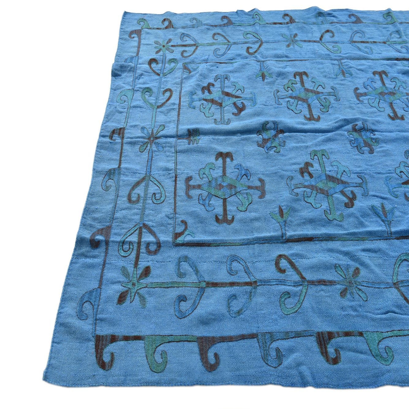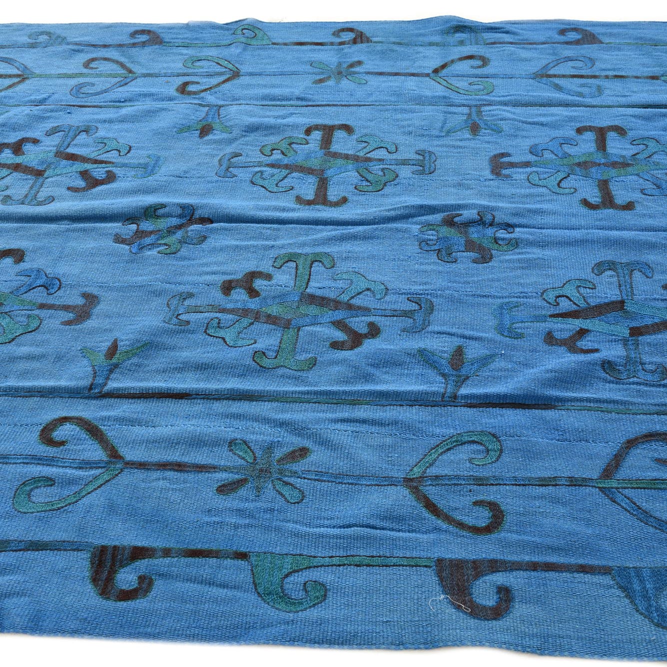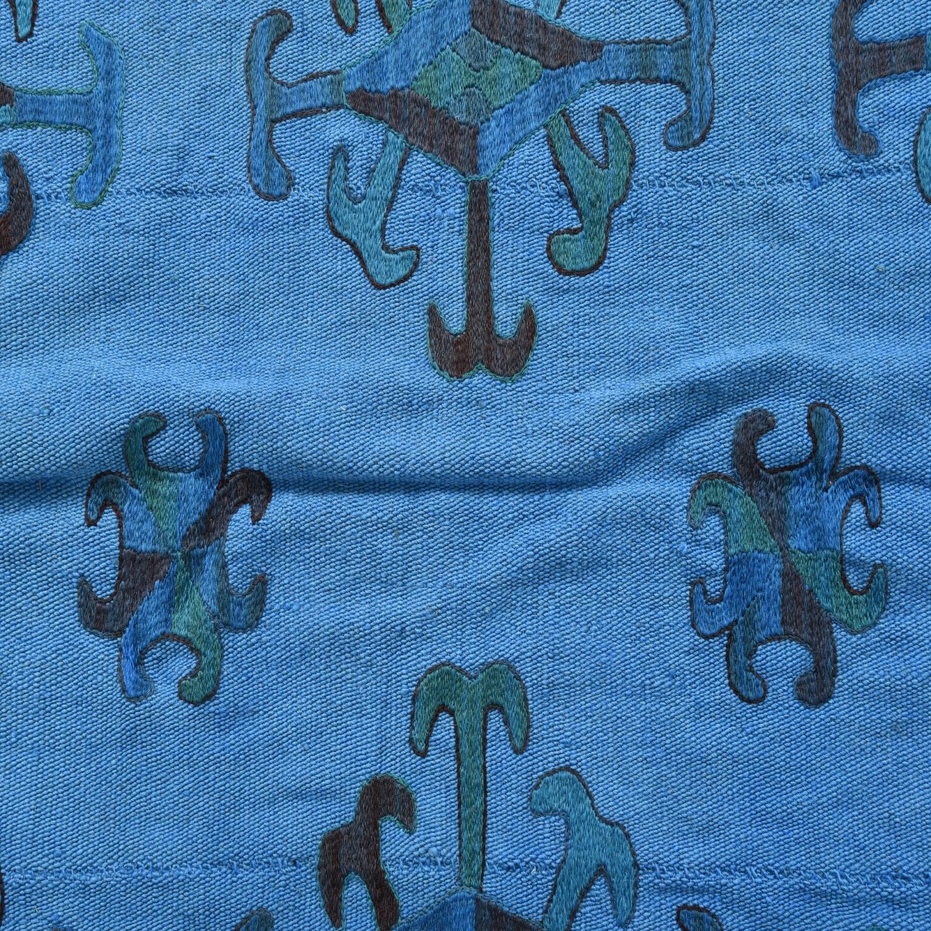 A 6x9 rectangular blue flatweave rug with a tribal Suzani pattern and abstract oriental motifs.