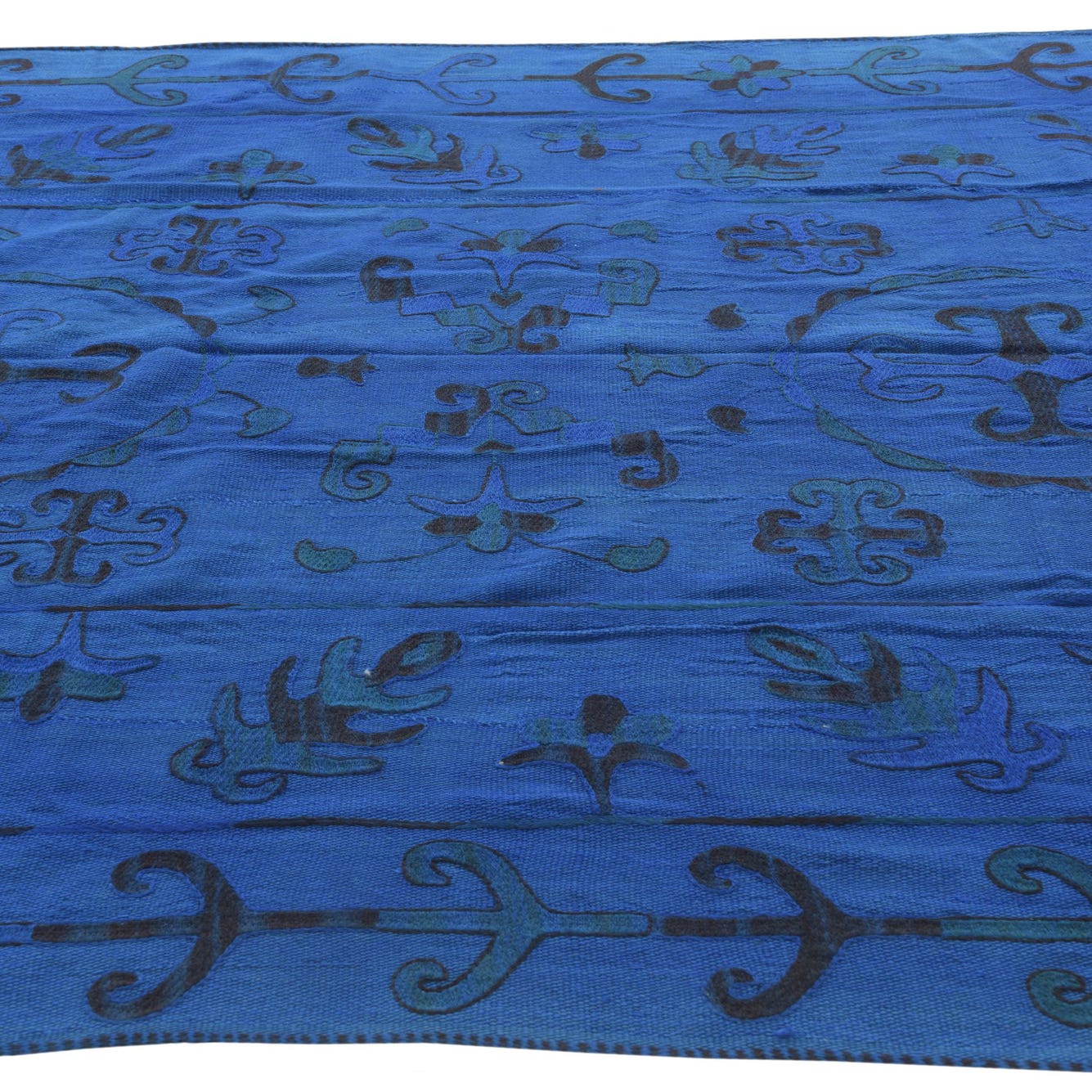 A 6x9 rectangular blue flatweave rug with a dark blue tribal and oriental pattern, suitable for a living room.