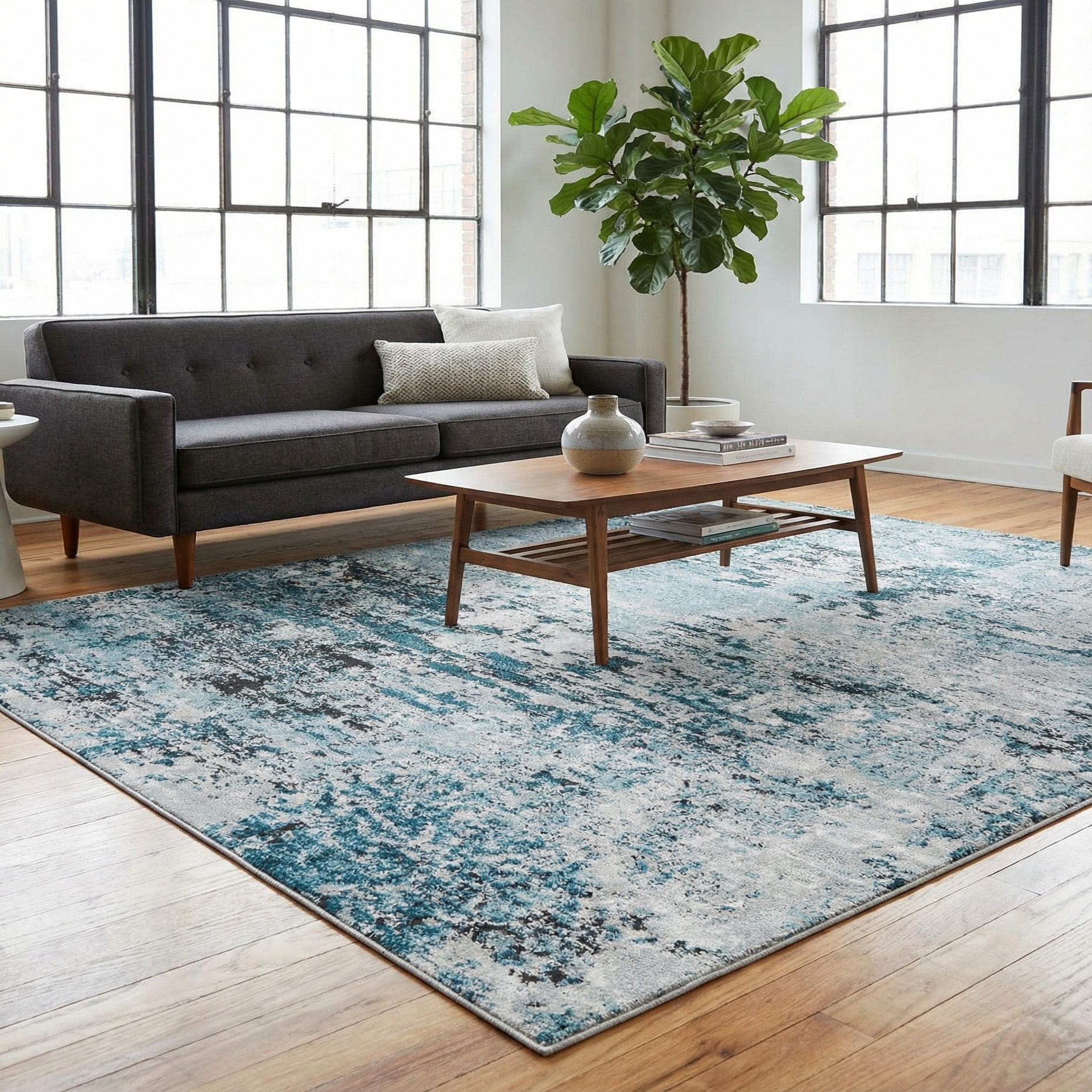 The versatile color palette and modern design make the rug suitable for an array of interior design scenarios, including but not limited to a serene bedroom setting, a refined living room space, or a sophisticated home office. The cool tones can complement minimalistic or Scandinavian-themed decors beautifully, as well as coastal or contemporary styles that emphasize a relaxed yet refined aesthetic.