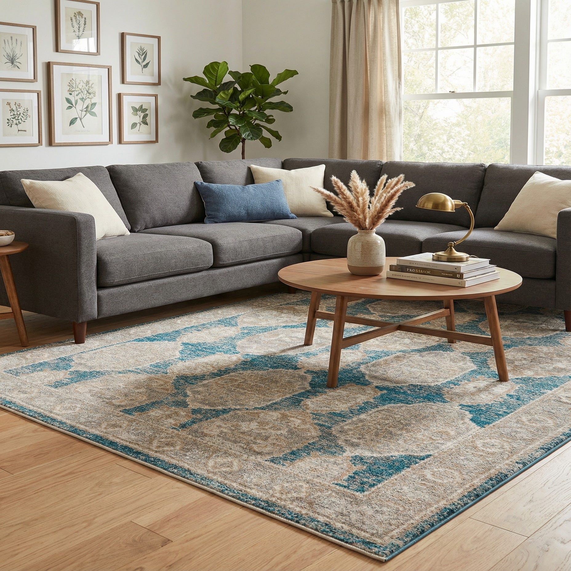 This piece works well in transitional and coastal-inspired rooms where color and pattern are needed without overpowering the scheme. Pair it with light wood or whitewashed furniture and linen upholstery for an airy living room, use it to anchor a dining area with neutral seating, or place it beneath a bed to add warmth and visual interest to a bedroom. The blue ground coordinates easily with navy, gray, or warm neutrals for a composed, pulled-together look.