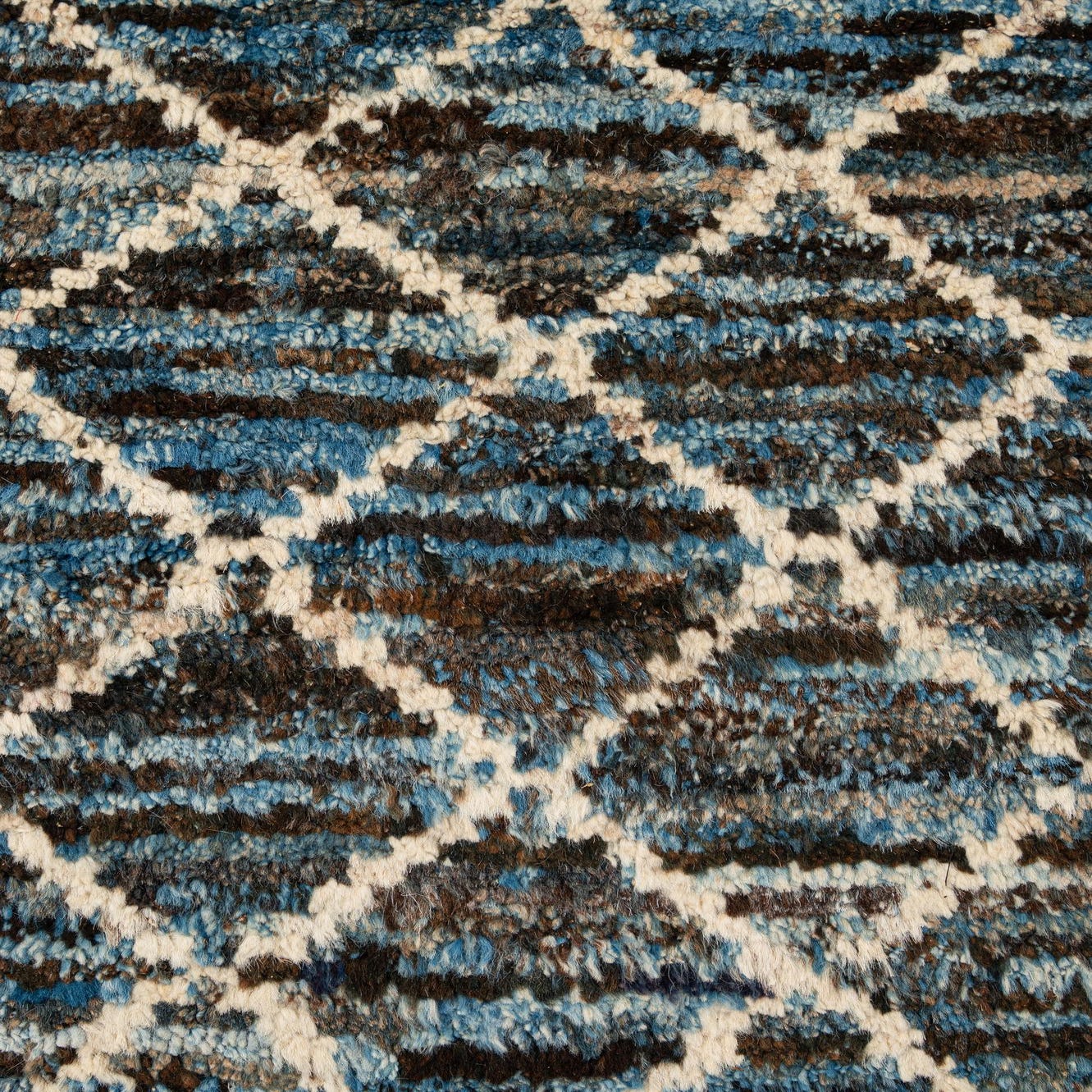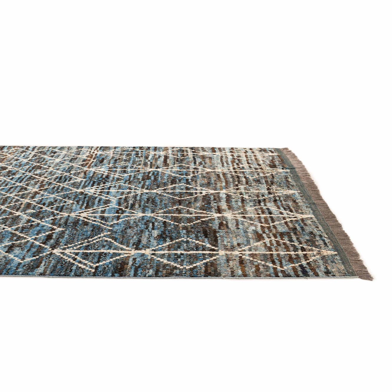 A 6x9 rectangular Moroccan tribal rug in varying shades of blue and brown with a modern geometric diamond pattern in cream.