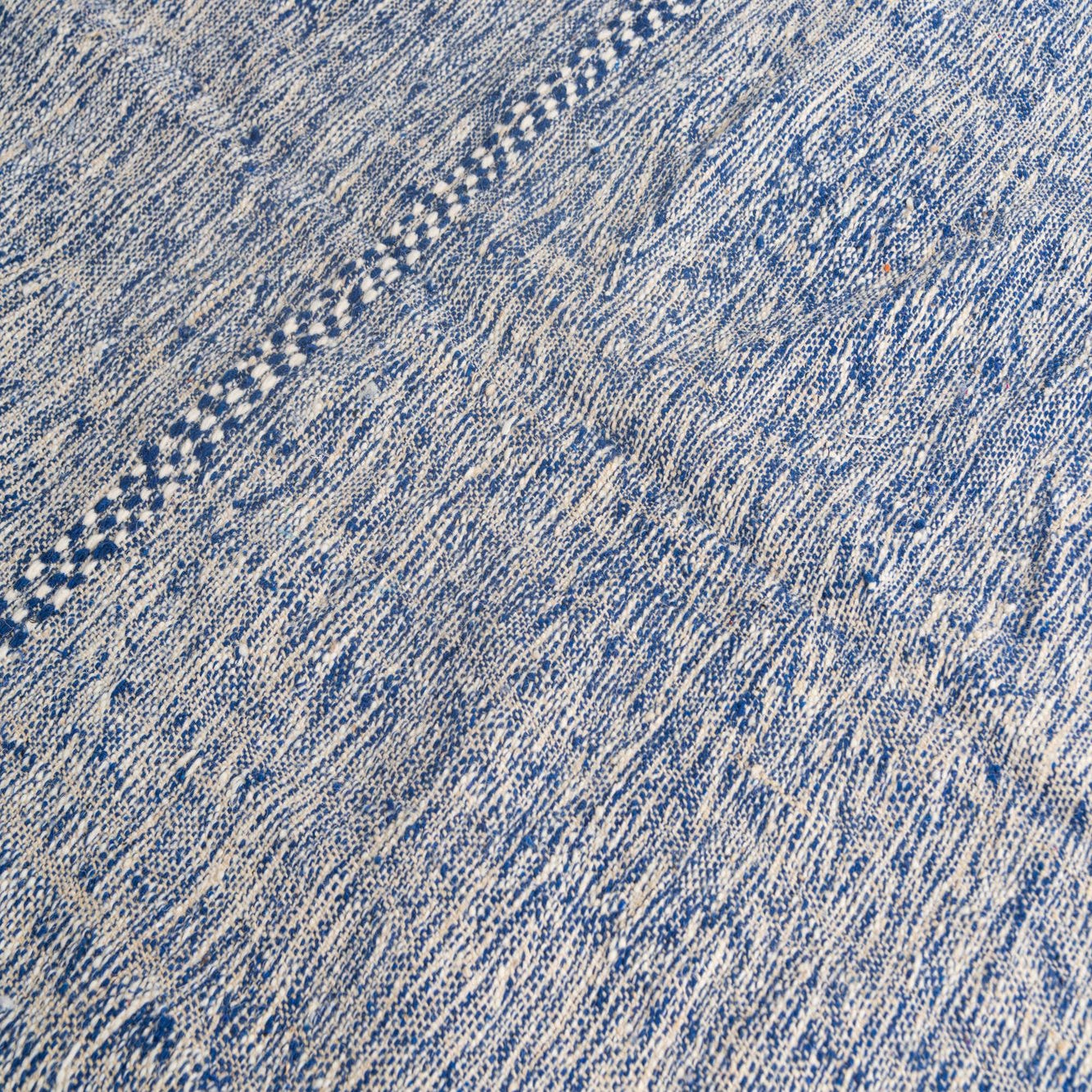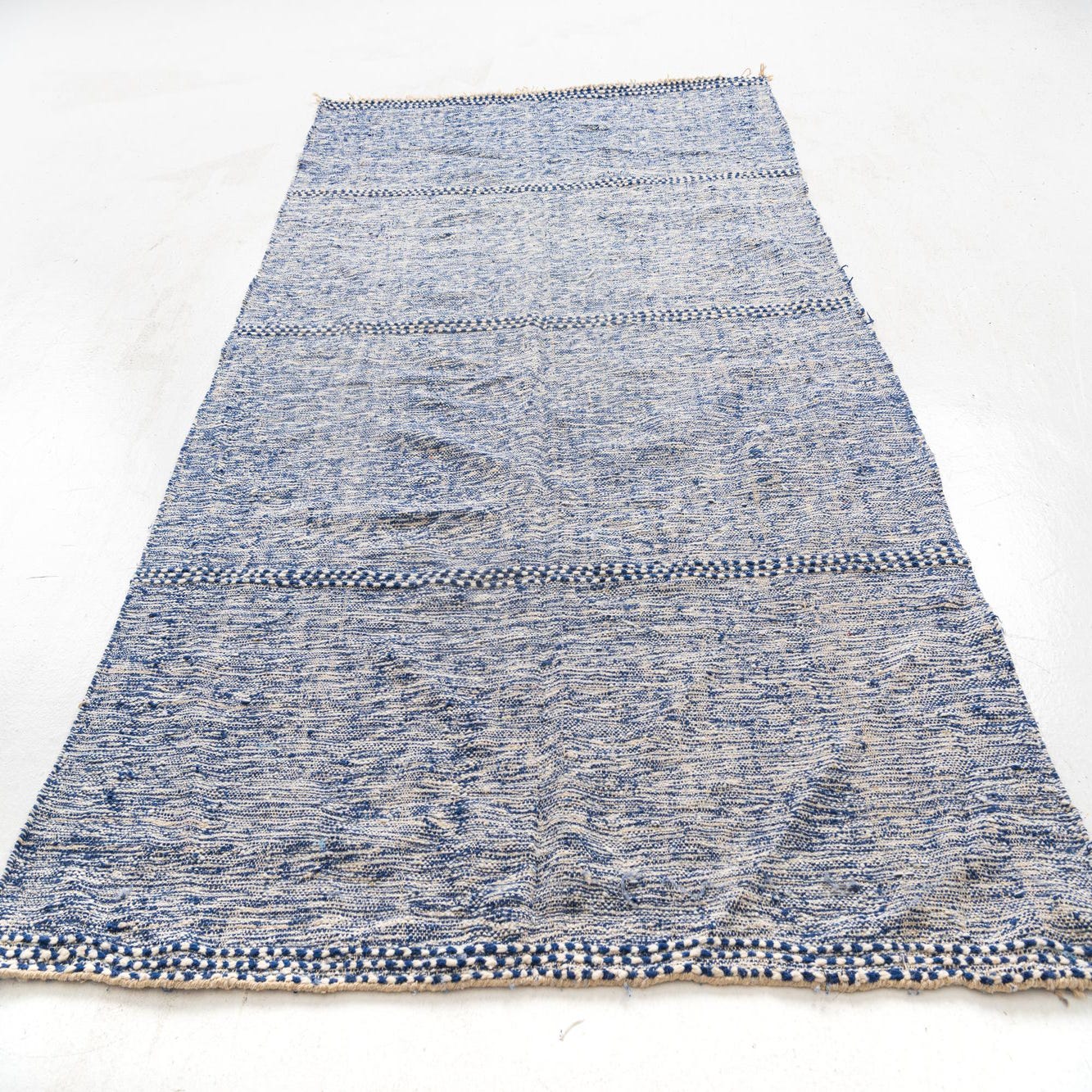 A 6x9 rectangular blue and cream tribal shag rug with horizontal striped patterns and fringe.