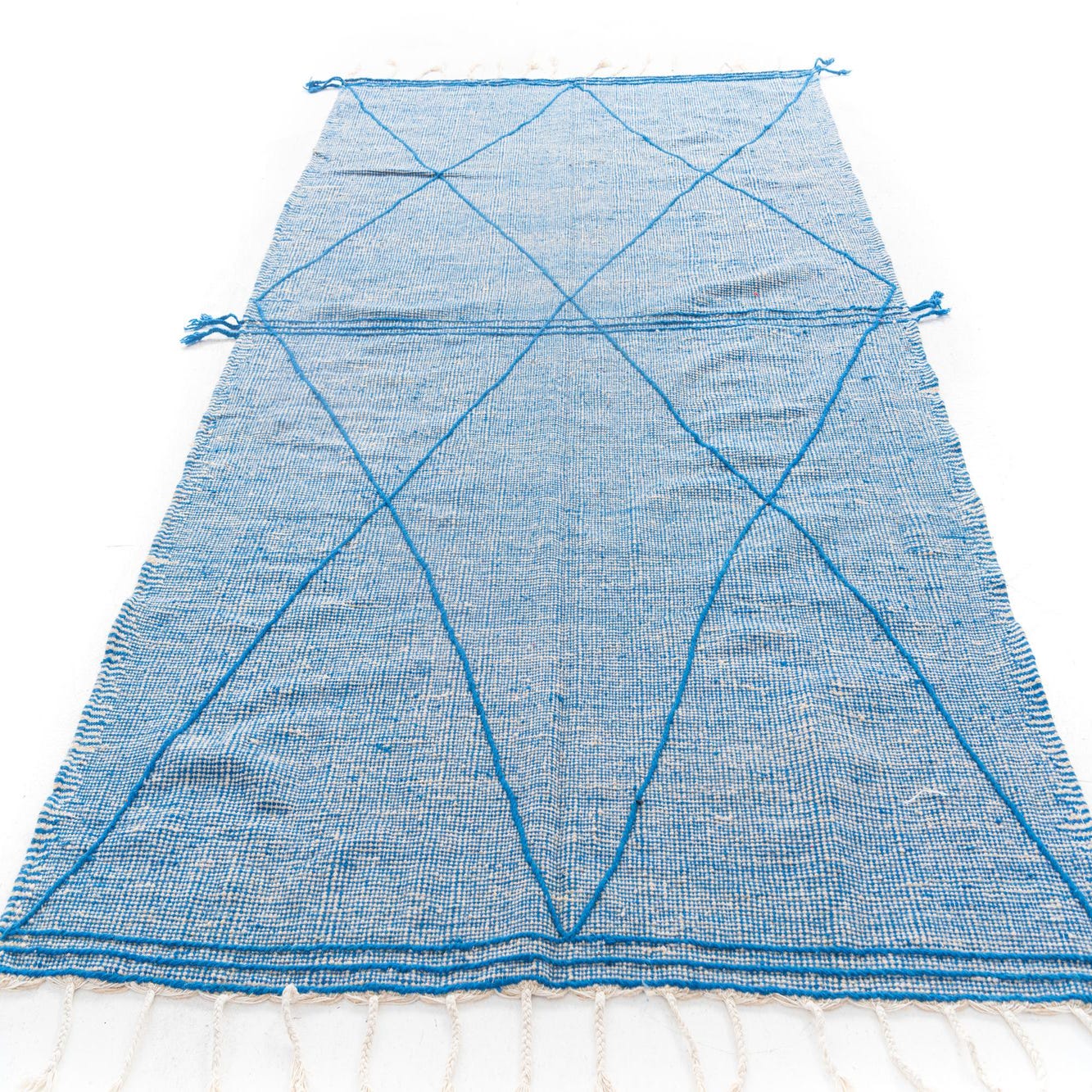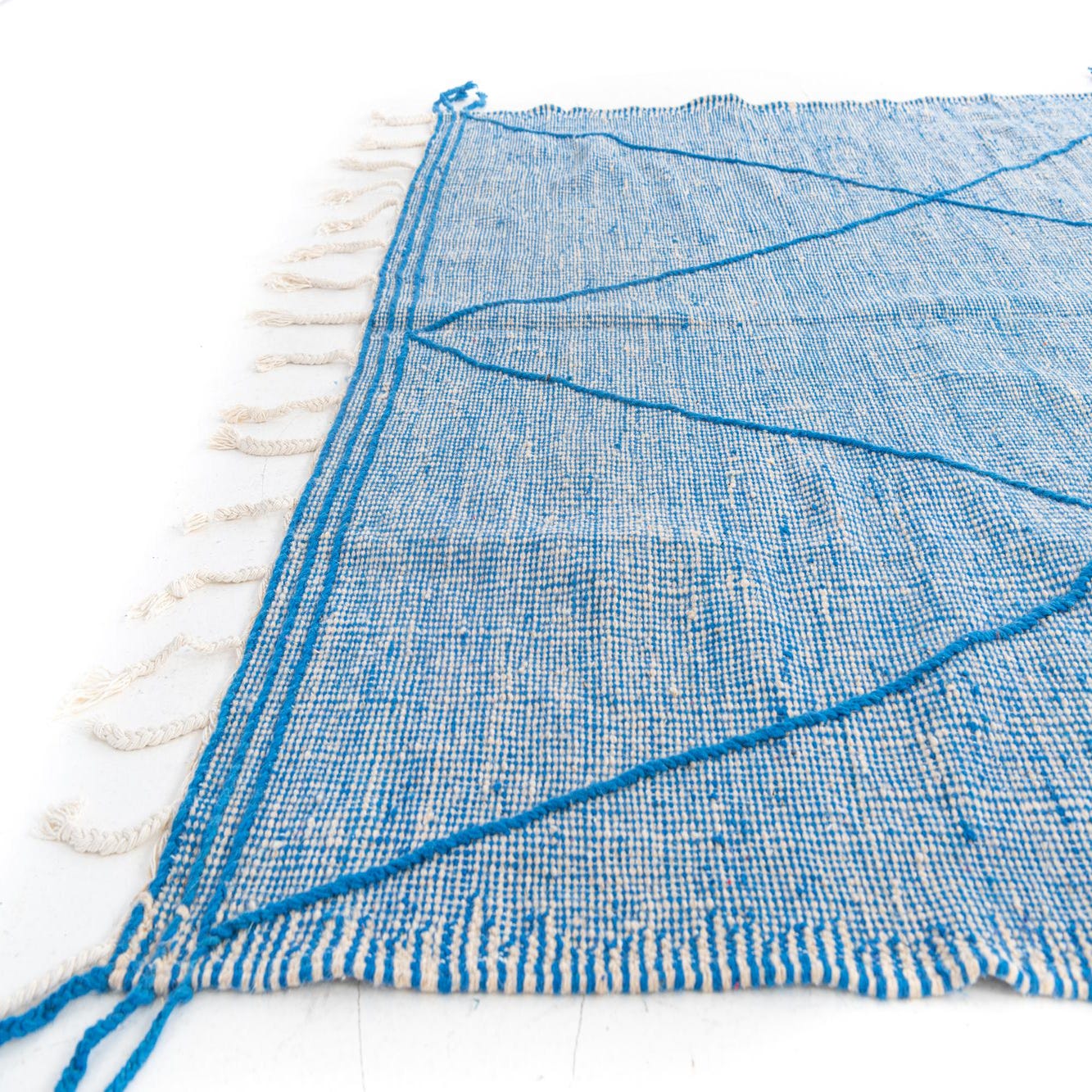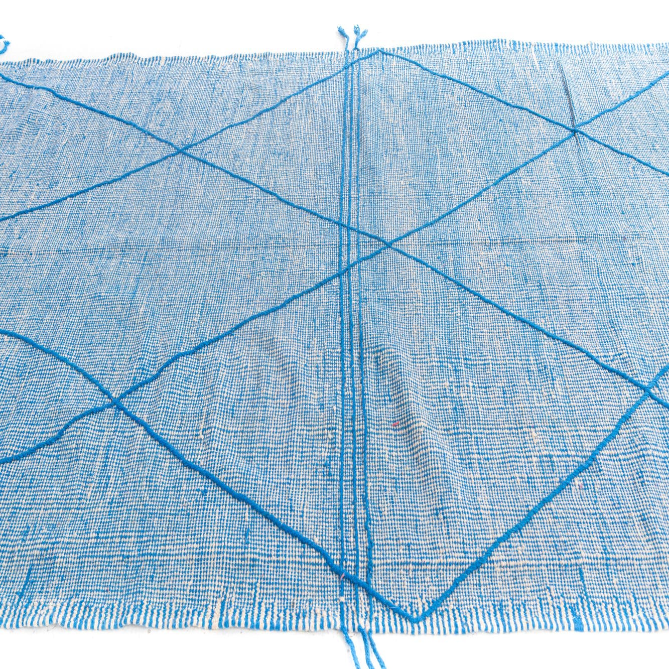 A 6x9 rectangular blue and white Moroccan shag rug with a bold tribal diamond pattern and fringe.