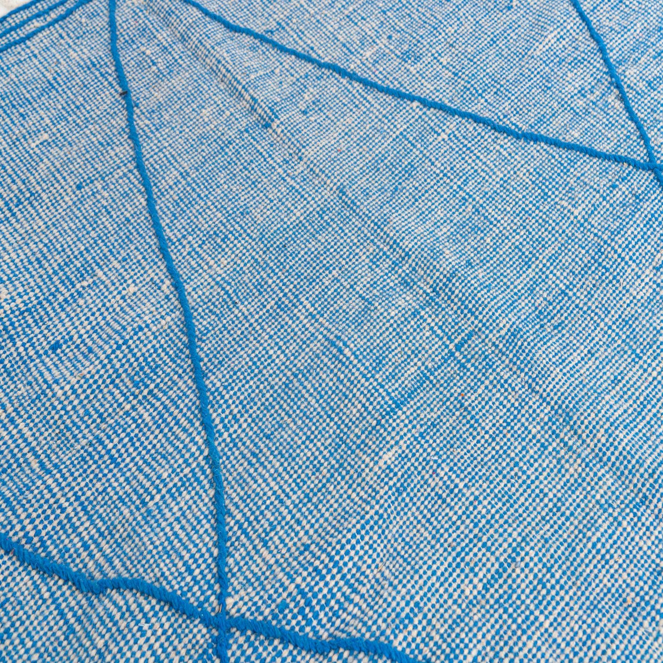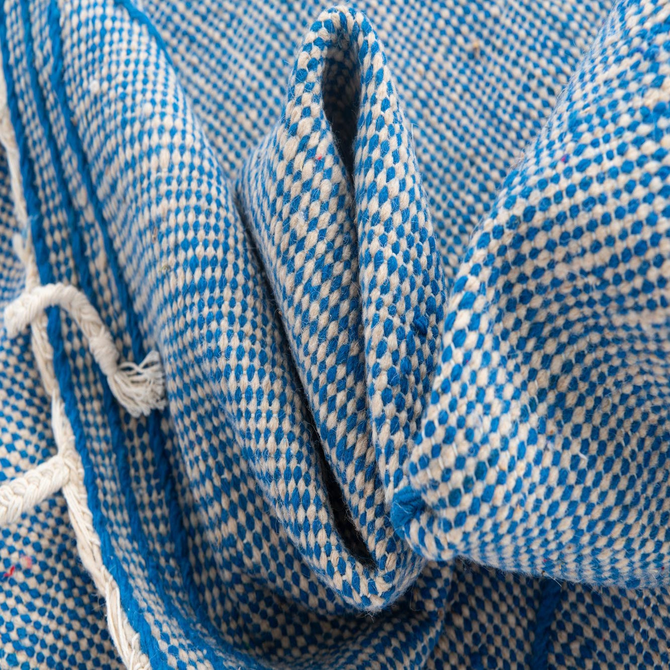 Low-profile, hand-knotted wool with a soft, slightly slubby texture that feels both casual and refined. A saturated blue ground woven with ivory slubs creates a subtle, lived-in field, while a large-scale diamond lattice in a deeper blue is knotted across the surface for clear geometric definition. Short knotted fringes at each end reinforce the handcrafted character and add a tactile finishing touch.