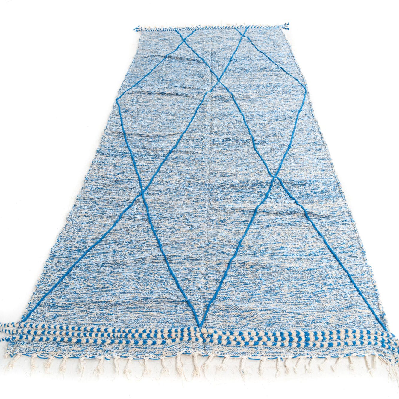 This Moroccan Collection rug is an authentic hand-knotted piece crafted from 100% wool, offering a durable and tactile texture. Measuring 6x9 feet, the rug features a two-tone palette of blue and ivory, grounded in a robust blue background. Its pattern includes a minimalist diamond lattice design that contributes to its visual interest without overpowering its surroundings. Traditional fringe detailing complements the rug's semi-antique status, further accentuating its cultural heritage and artisanal integrity.