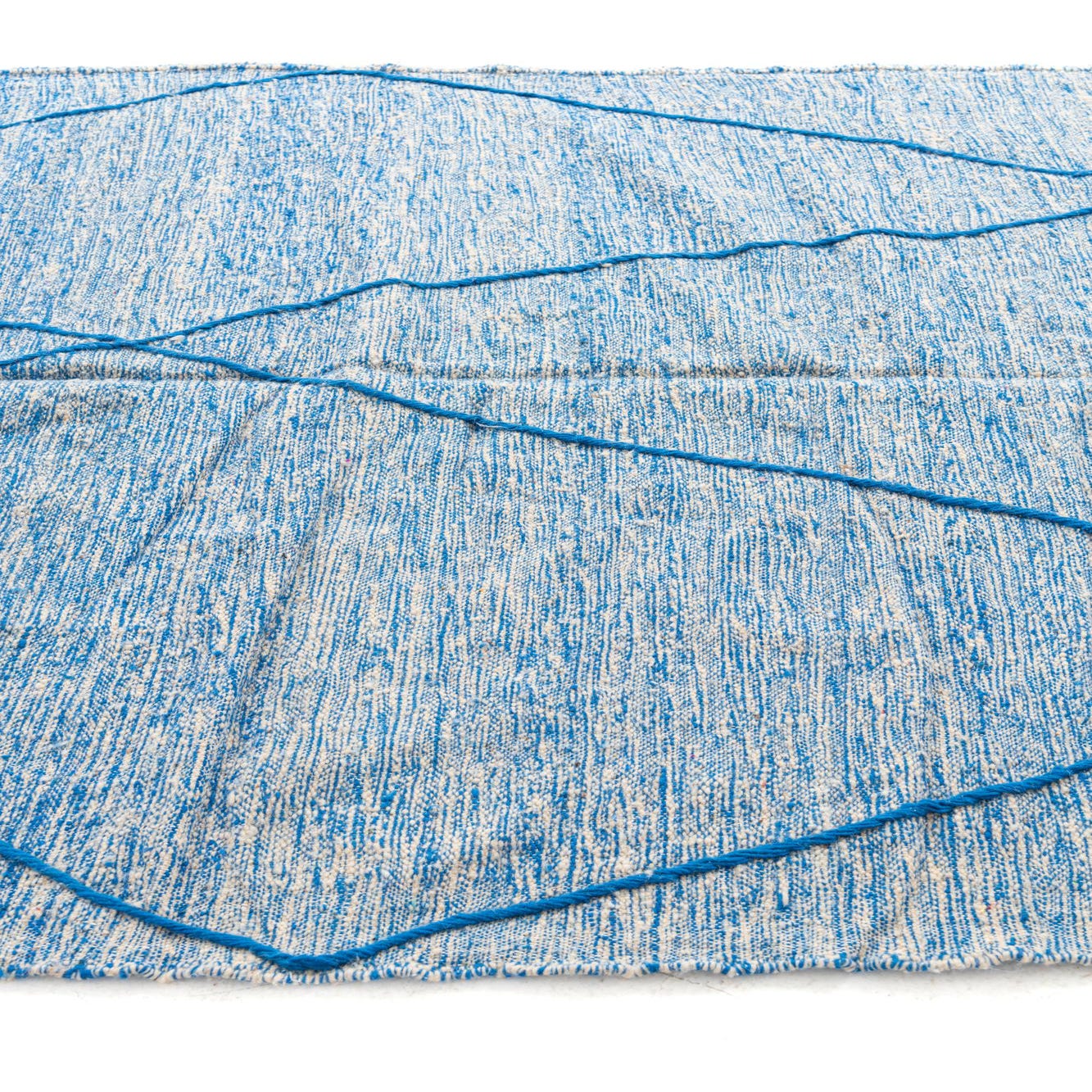 A 6x9 rectangular blue wool shag rug with a modern tribal diamond pattern and decorative fringe.