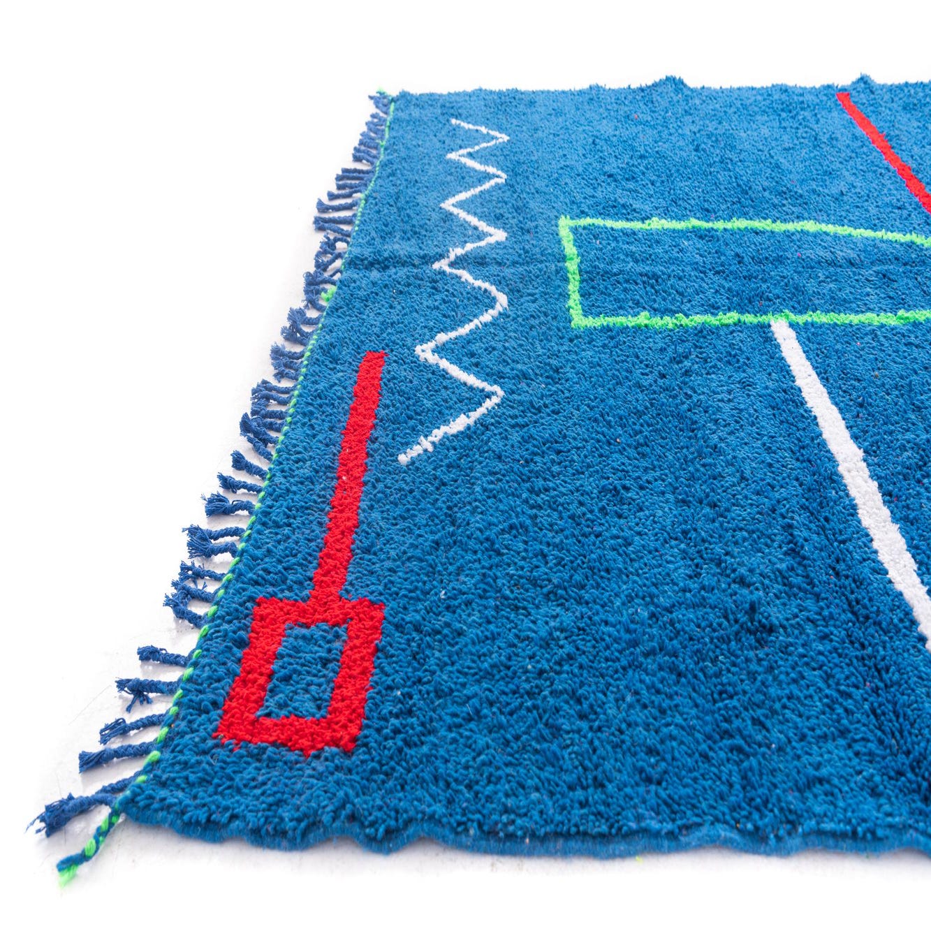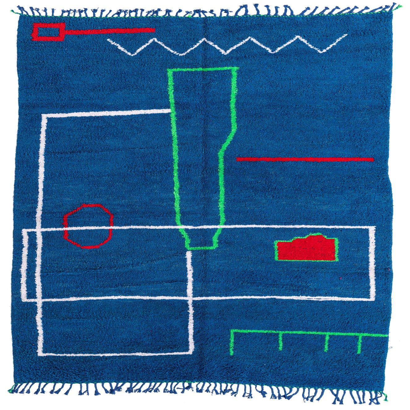 This Moroccan collection rug brings a vibrant splash of color and pattern into any space. Hand-knotted from 100% wool, this 6x9 area rug features a dynamic array of blue as its primary background tone, accompanied by contrasting ivory, red, and green accents that create a bold, geometric pattern throughout the piece. The use of color and straightforward design elements impart a sense of energy and casual sophistication.