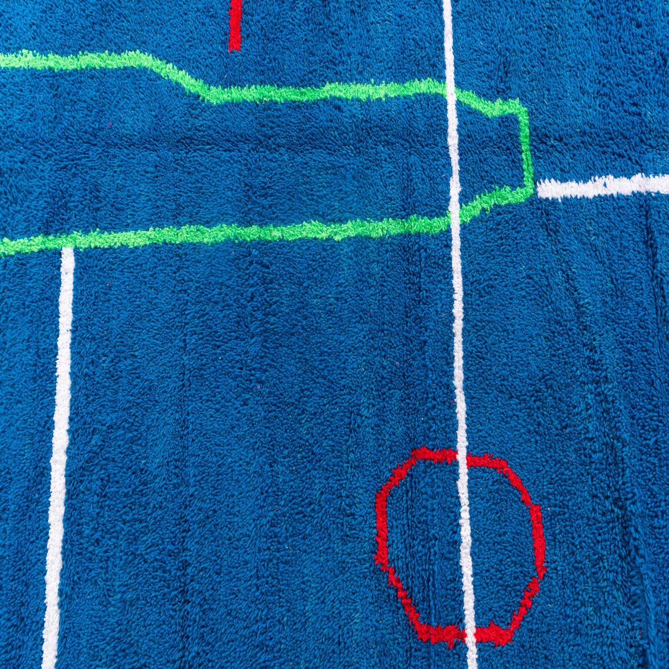 A 6x9 rectangular blue shag rug with a modern tribal abstract pattern in red, white, and green, suitable for a living room.