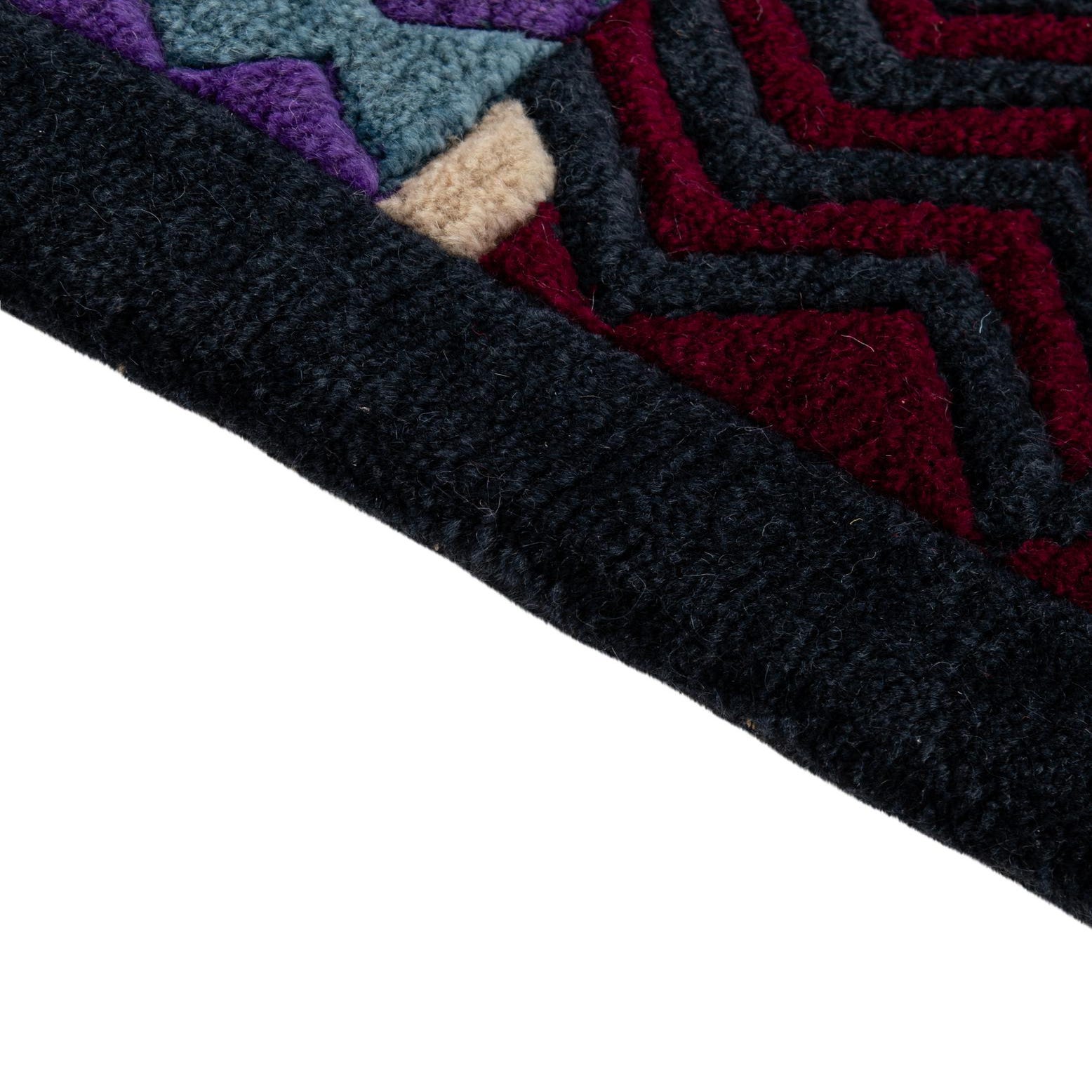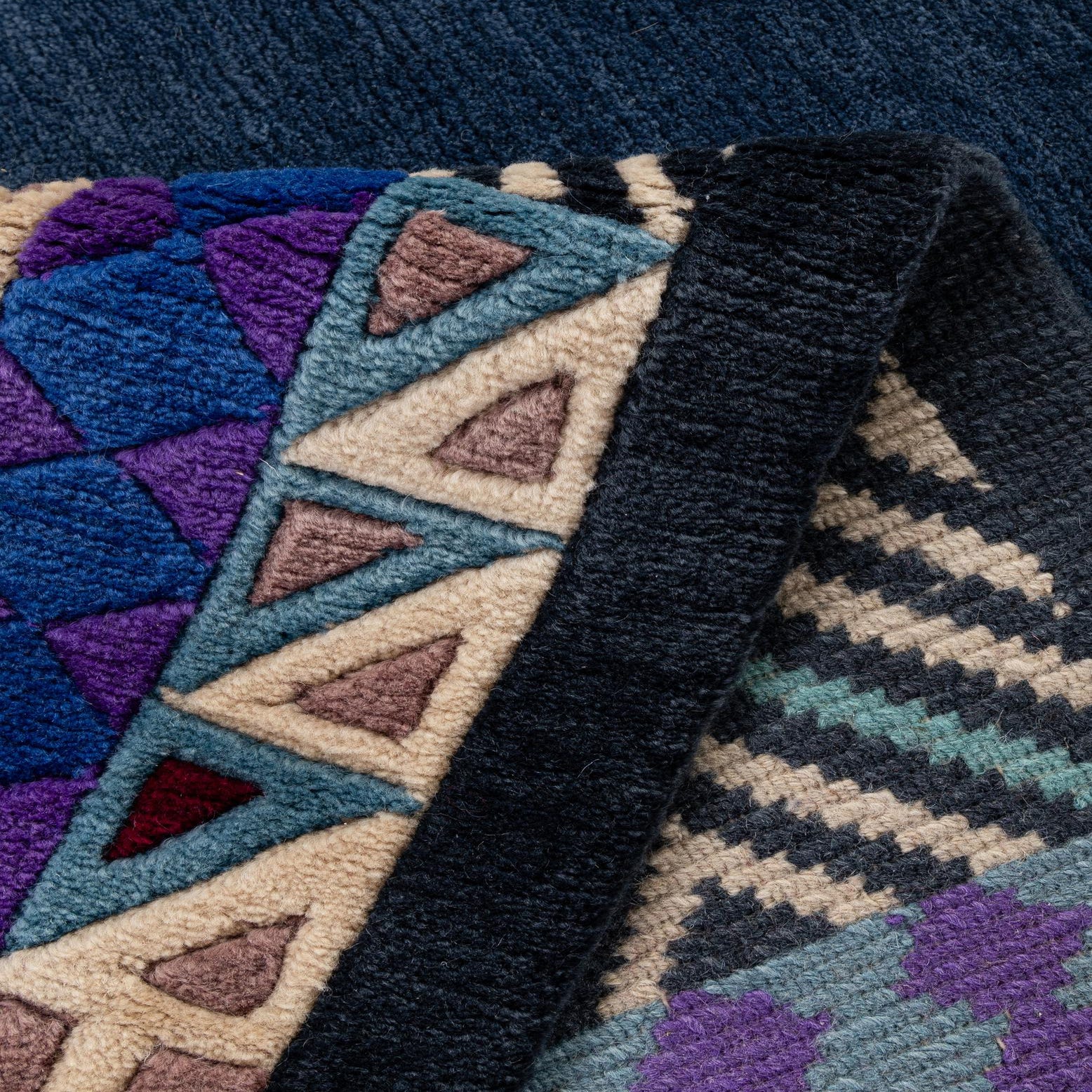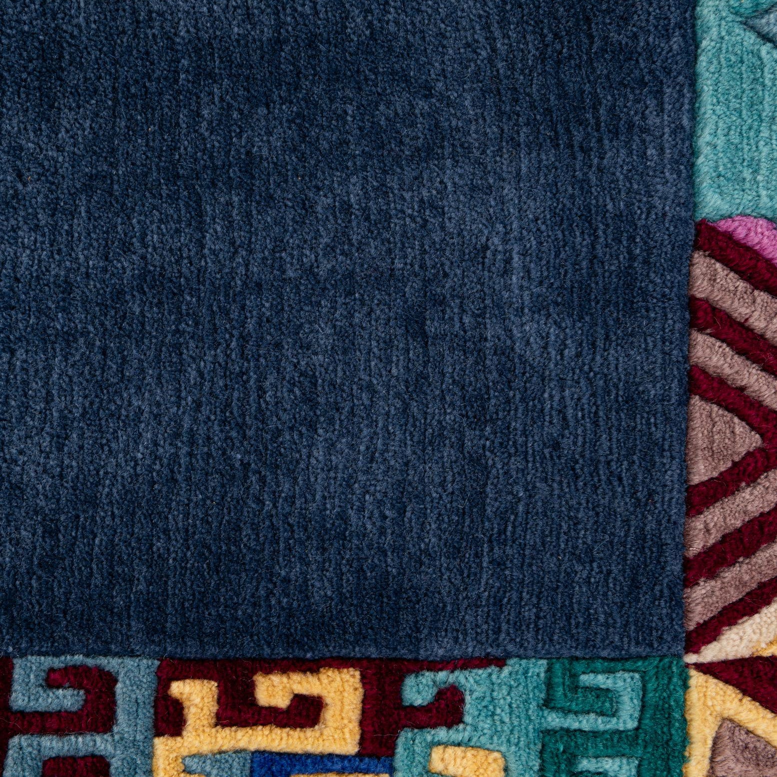 A 6x9 rectangular blue wool rug with a high pile. It features a modern oriental border with geometric patterns in teal, yellow, purple, and black.