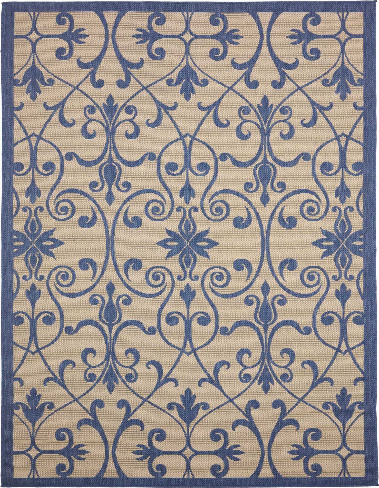 The Outdoor Botanical collection presents a 6x9 area rug that features a harmonious blend of functionality and style. Machine-woven of 100% polypropylene, this flatweave piece offers durability and easy maintenance, making it an ideal choice for high-traffic areas. The rug showcases an elegant botanical pattern, with curling vines and floral motifs rendered in a pairing of beige against a calming blue background, creating an alluring contrast that will stand out in any outdoor setting.