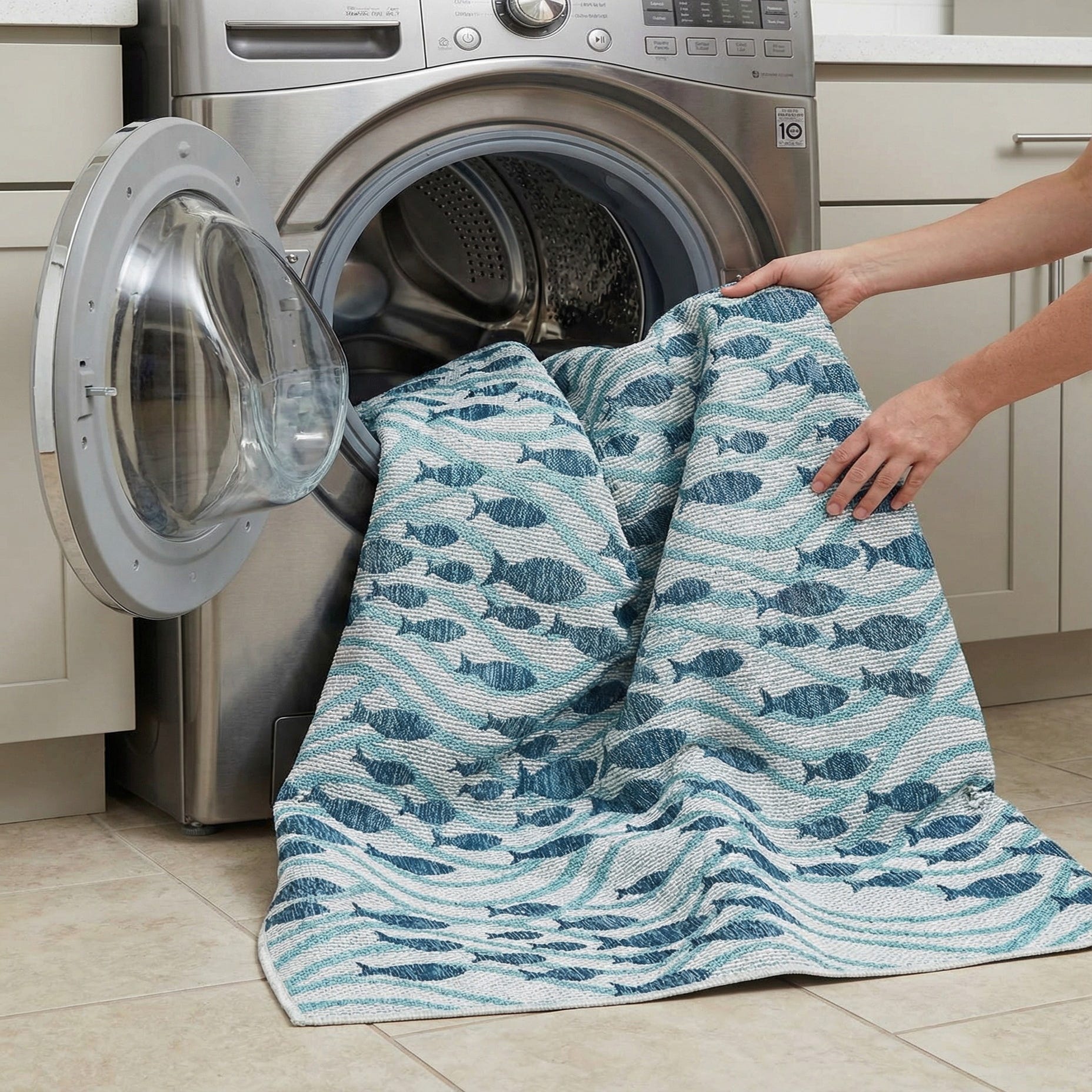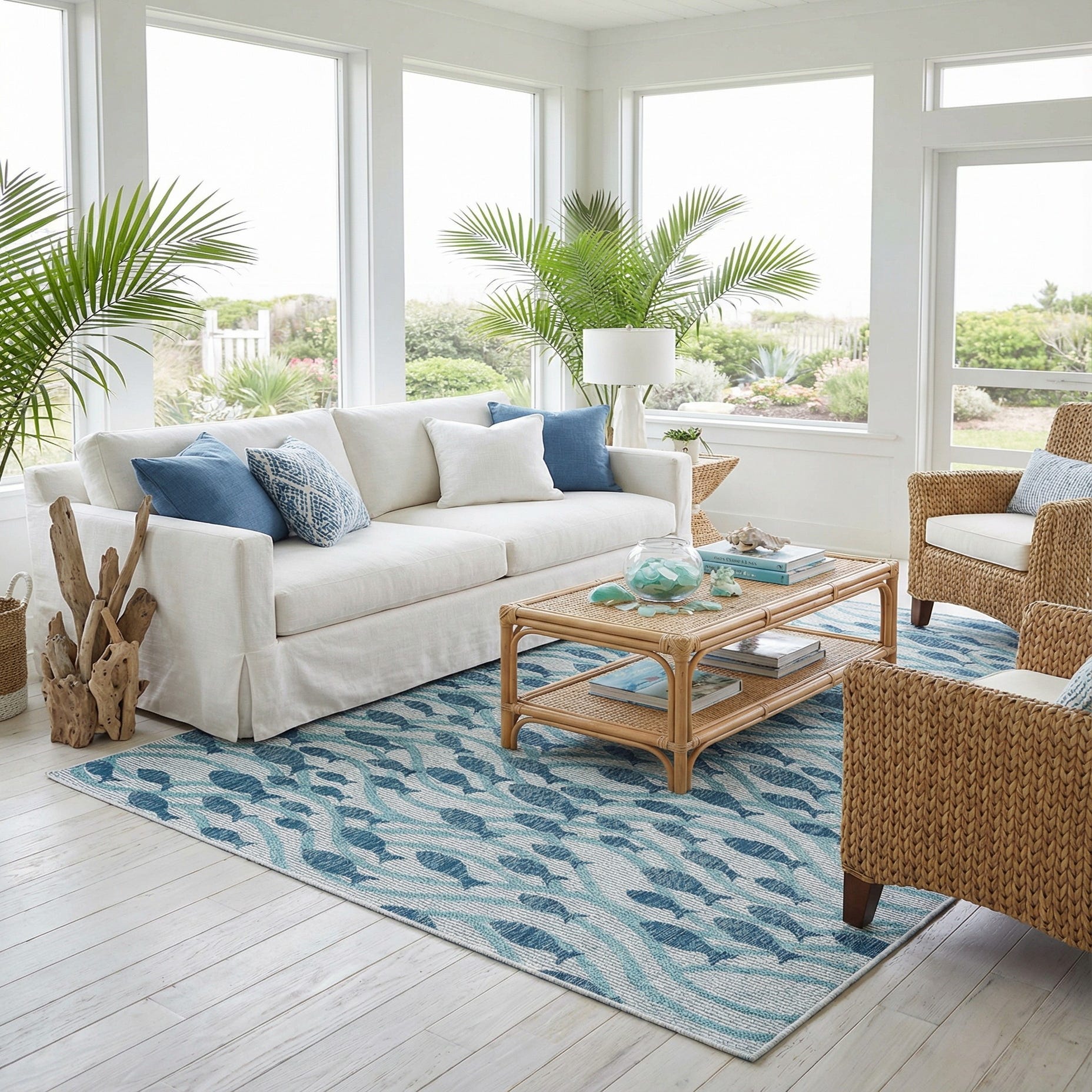 A 6x9 rectangular indoor/outdoor rug featuring a playful coastal design with dark blue fish swimming amidst light blue waves on a white background.