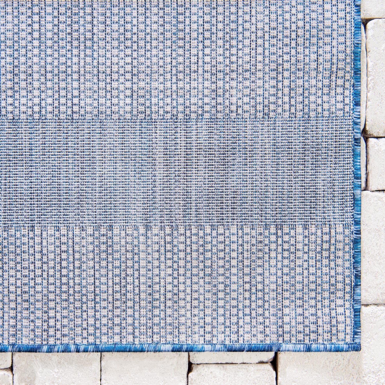 Wide, even ribbons of gray alternate across a deep blue background to form a clean, modern stripe pattern with a casual, coastal feel. Machine made from 100% polypropylene, the weave shows a subtle variegation in the blue fields that gives the surface a slight slubbed texture while the gray bands sit a touch smoother and more uniform. The rug has a low-profile, slightly ribbed hand underfoot that reads as durable yet approachable—textured enough to add visual interest without raising the pile.
