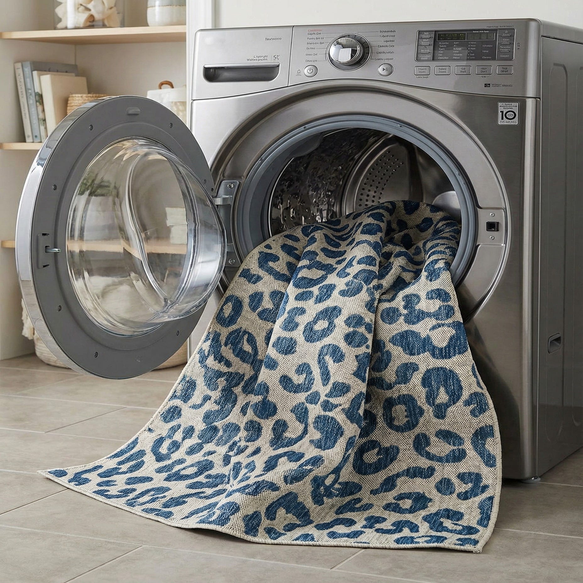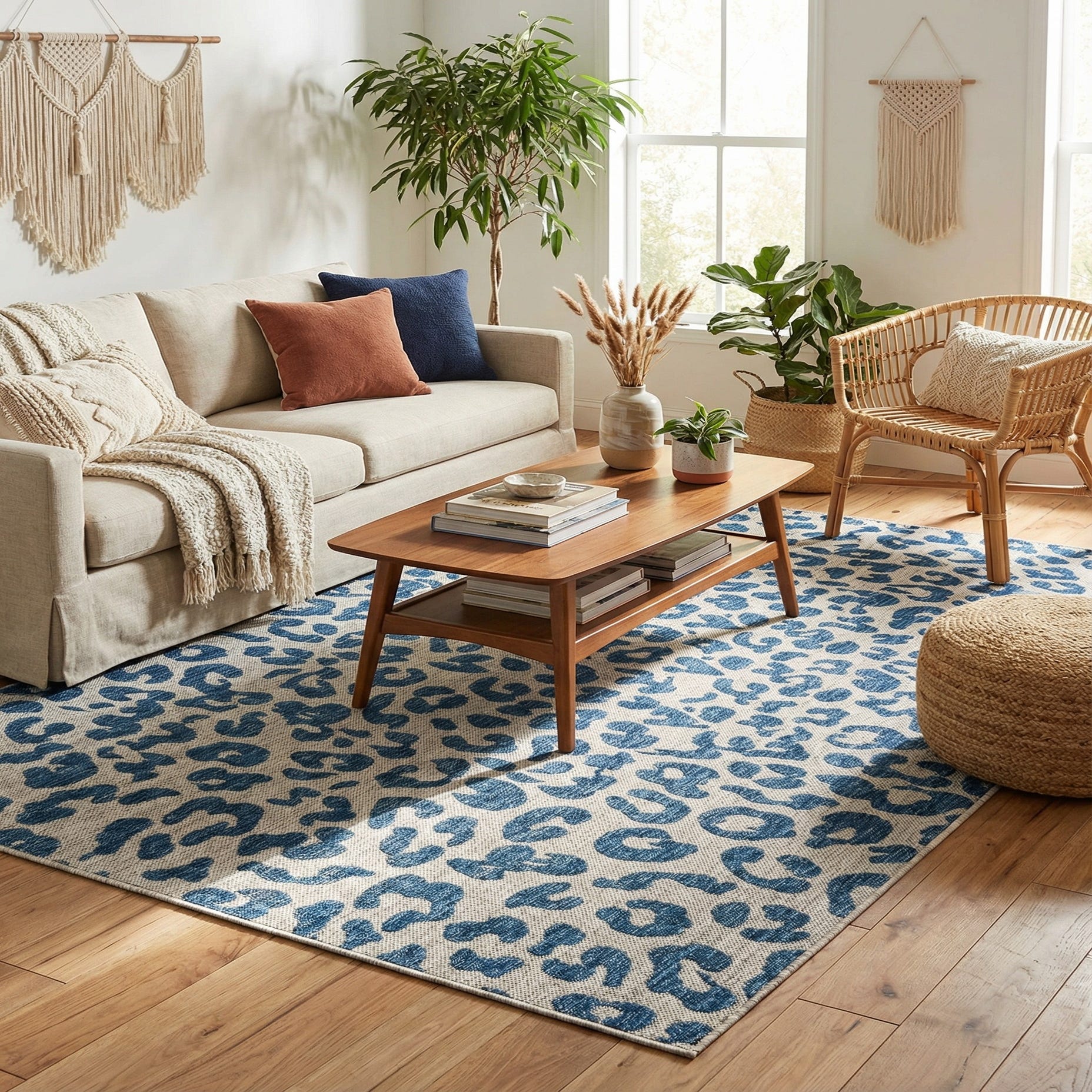 A 6x9 rectangular indoor/outdoor rug featuring a modern blue leopard print pattern on a light background.