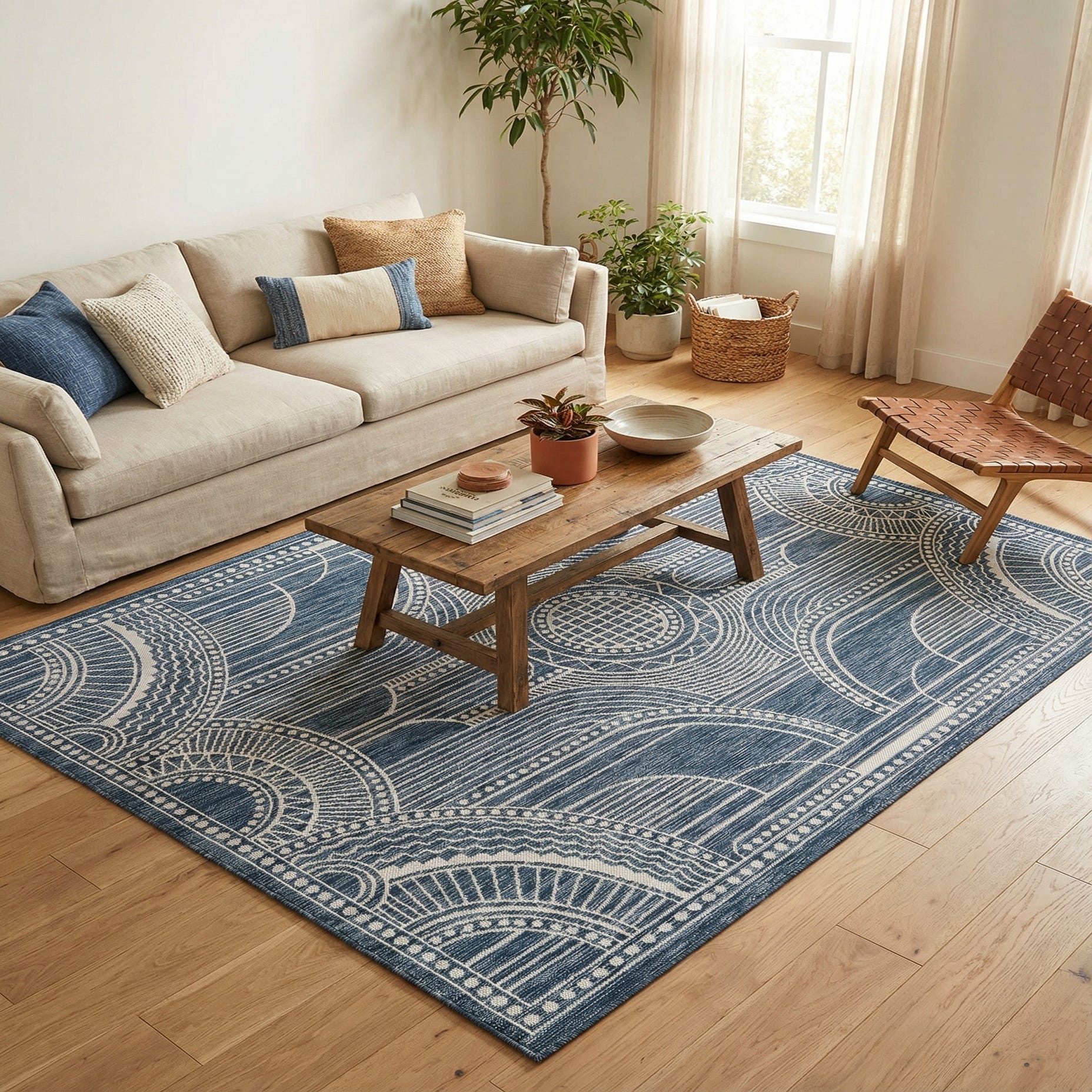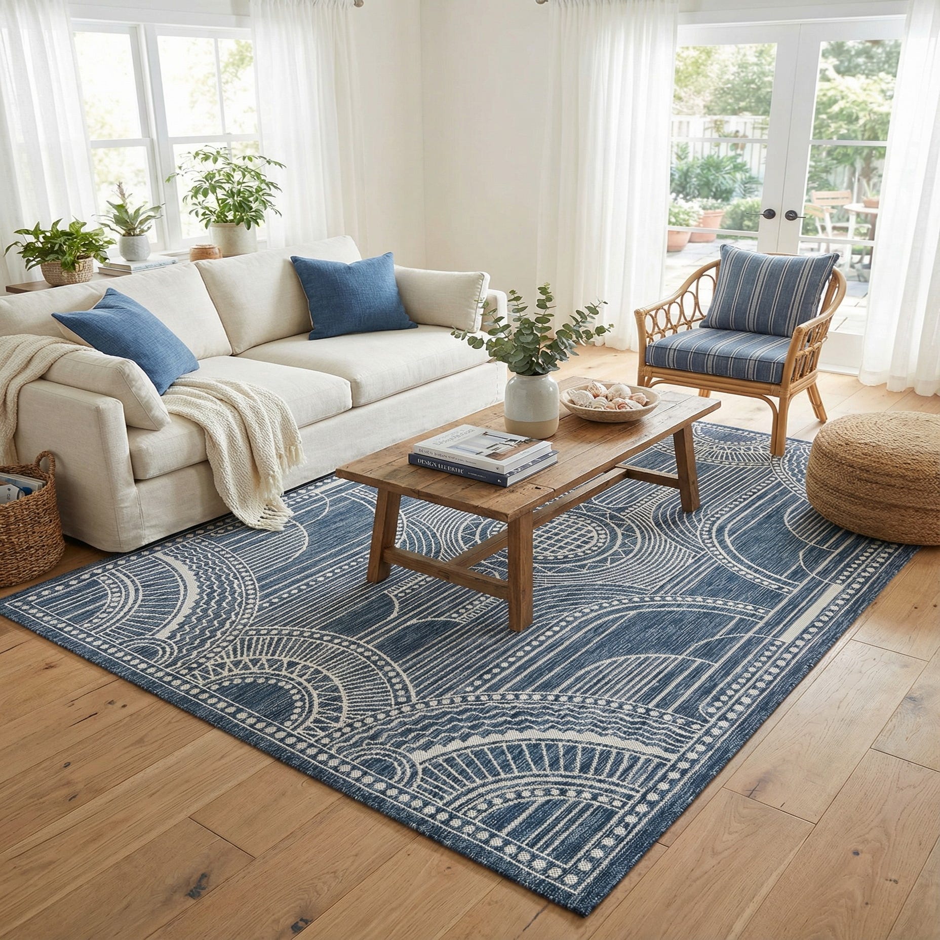 Machine-made from 100% polypropylene, the rug has a low-profile, tightly woven surface that feels firm underfoot and offers crisp definition between the blue ground and ivory design. Its construction makes it well suited for covered patios, porches and sunrooms as well as casual indoor spaces — think breezy living rooms, coastal dining areas, or a mudroom that needs a defined anchor. Pair it with teak or white-washed wood furniture, navy-and-ivory textiles, natural woven accents like jute, and crisp linen pillows to emphasize the blue-and-ivory palette and keep the room feeling relaxed and collected.
