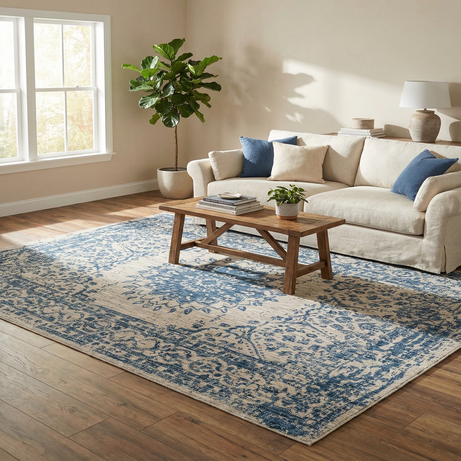 A 6x9 rectangular indoor/outdoor rug featuring a distressed blue medallion and traditional pattern on a light background.