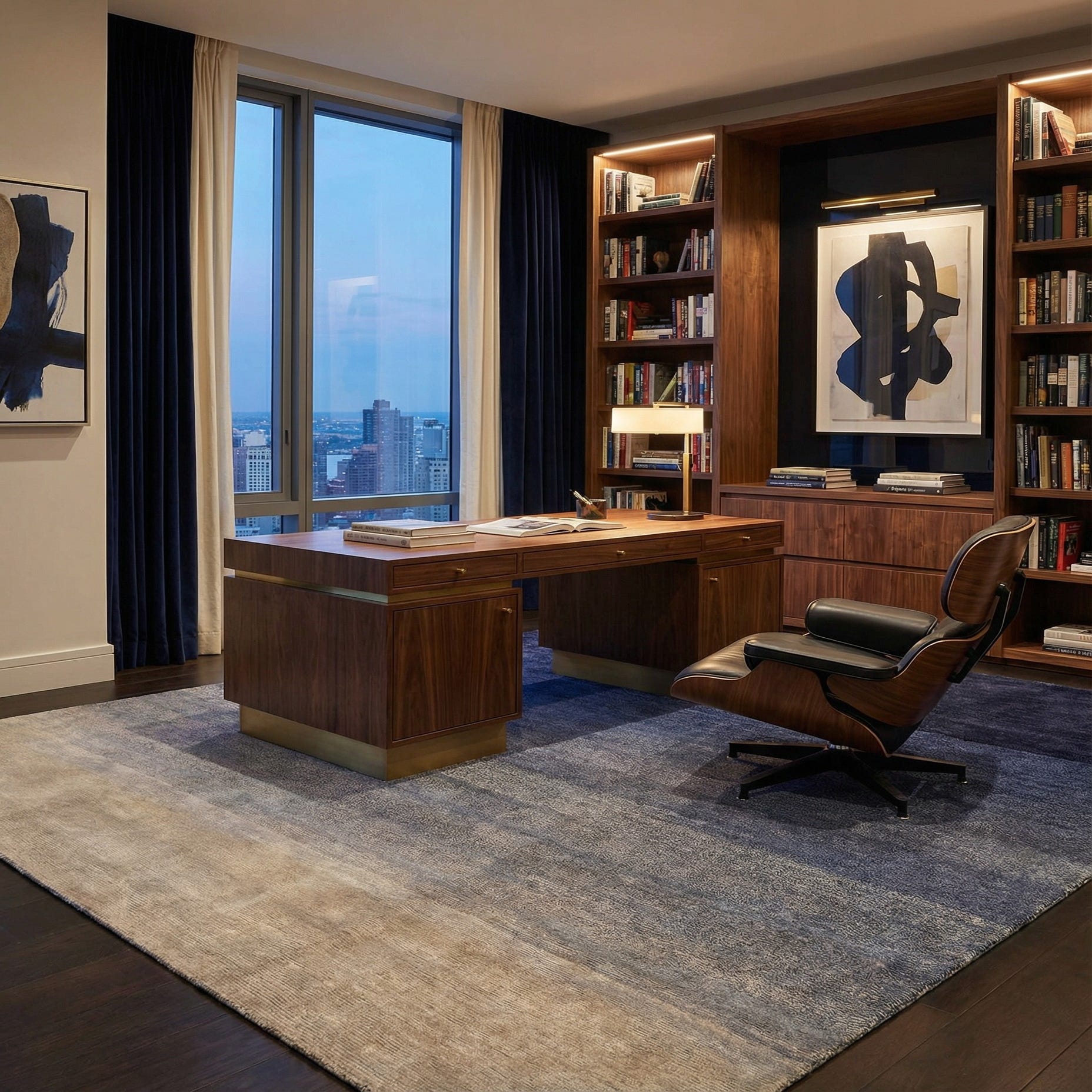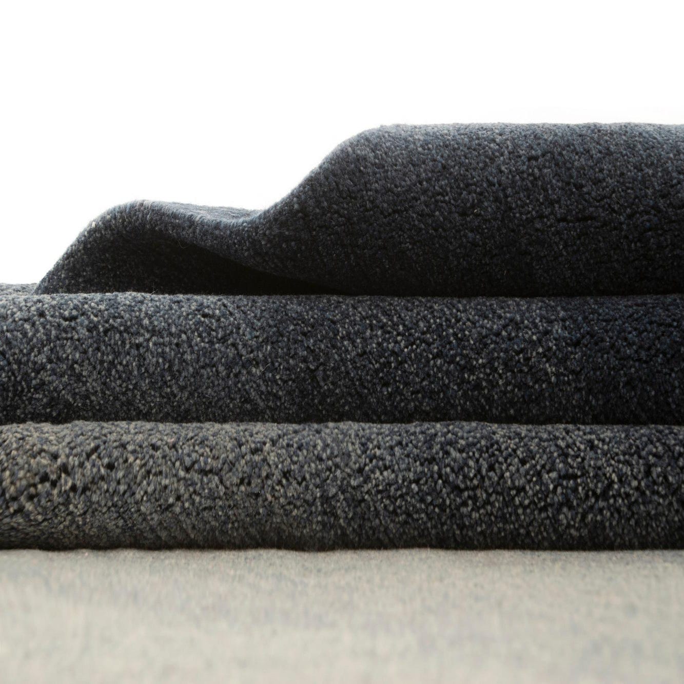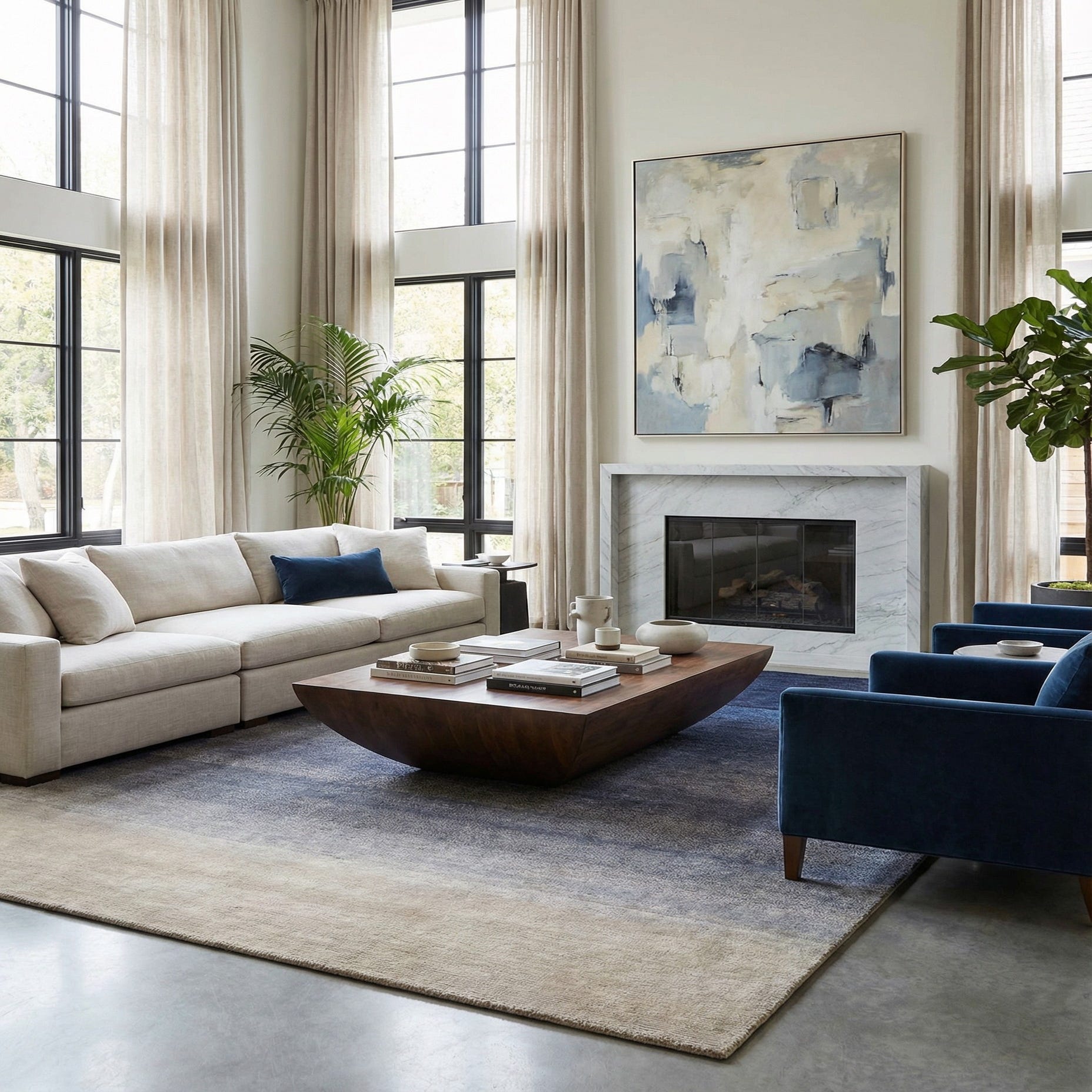 A 6x9 rectangular area rug with a blue ombre design, transitioning from light blue-grey to deep navy.