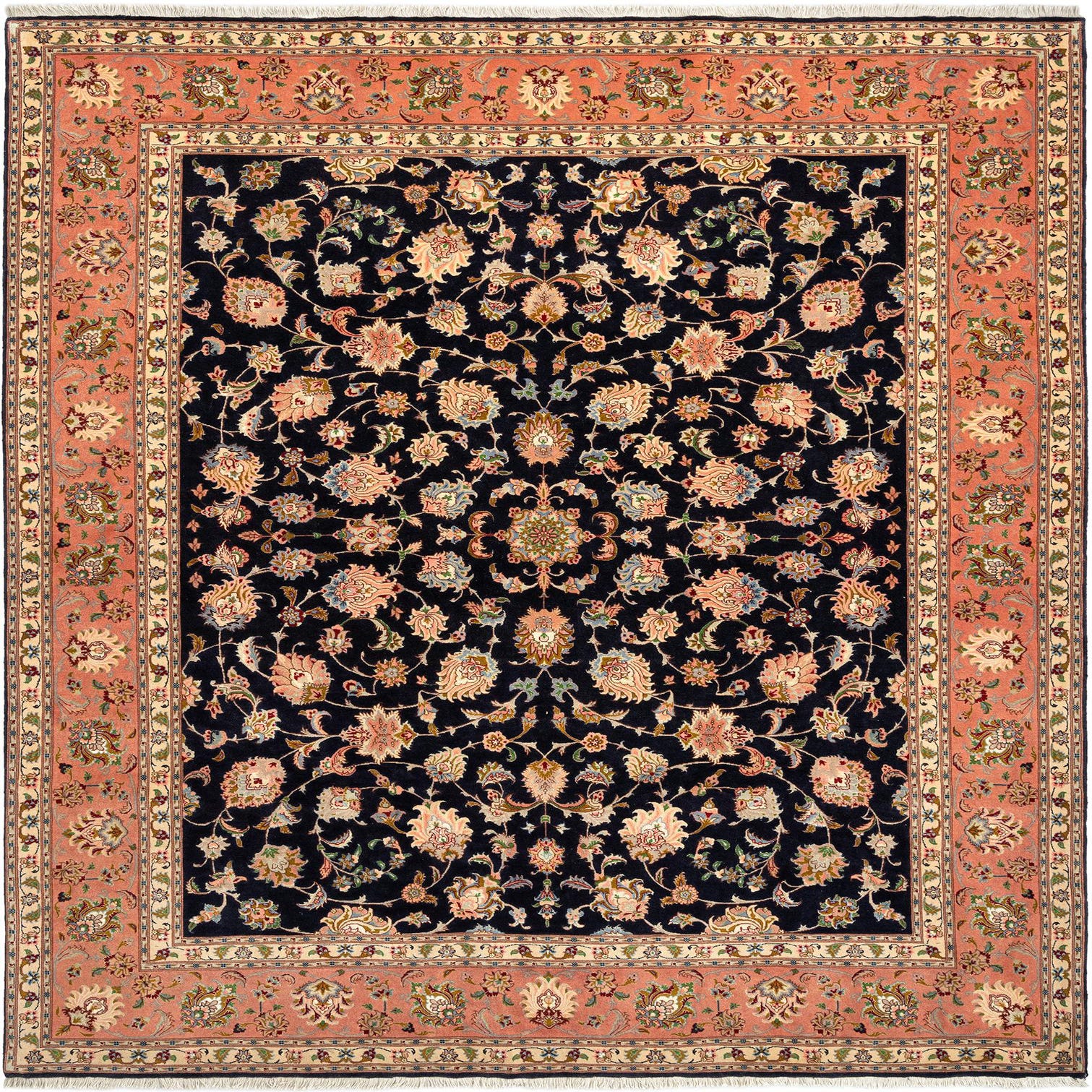 A 6x9 rectangular Persian rug with a deep blue field and intricate floral patterns, framed by a wide coral border.