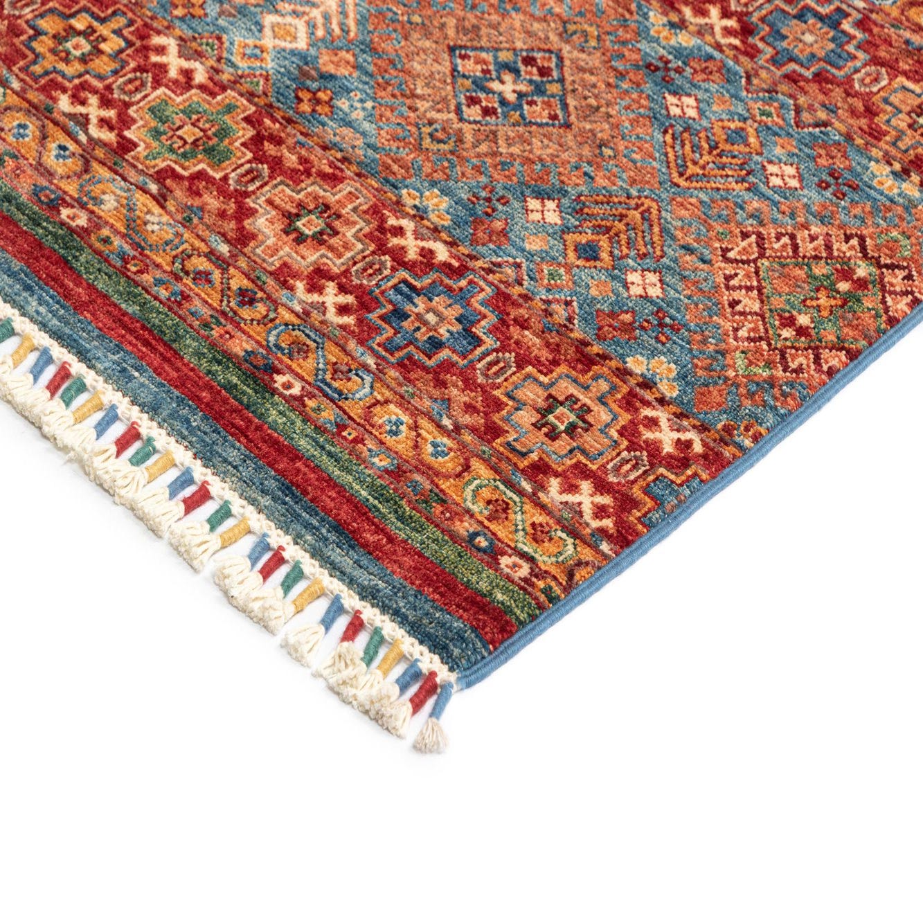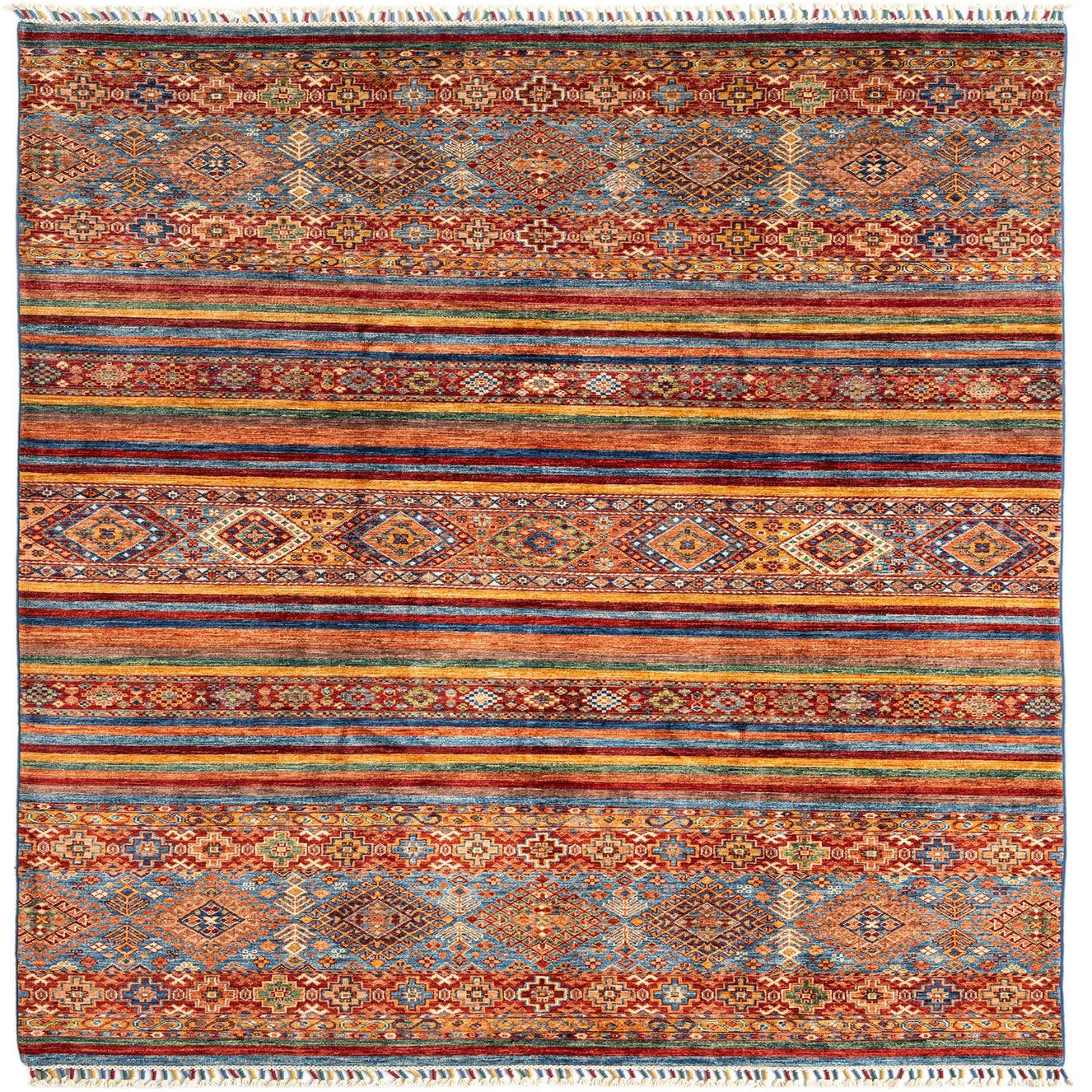 The Torkman Collection offers a 6x9 hand-made rug crafted from 100% wool, presenting a durable and comfortable foundation for a range of interior settings. This piece demonstrates a harmonious blend of colors including blue, red, brown, green, pink, and orange, with blue being the dominant background tone. Its pattern is a dynamic combination of geometric motifs and horizontal stripes, creating visual interest and texture that enhance its handcrafted appeal.
