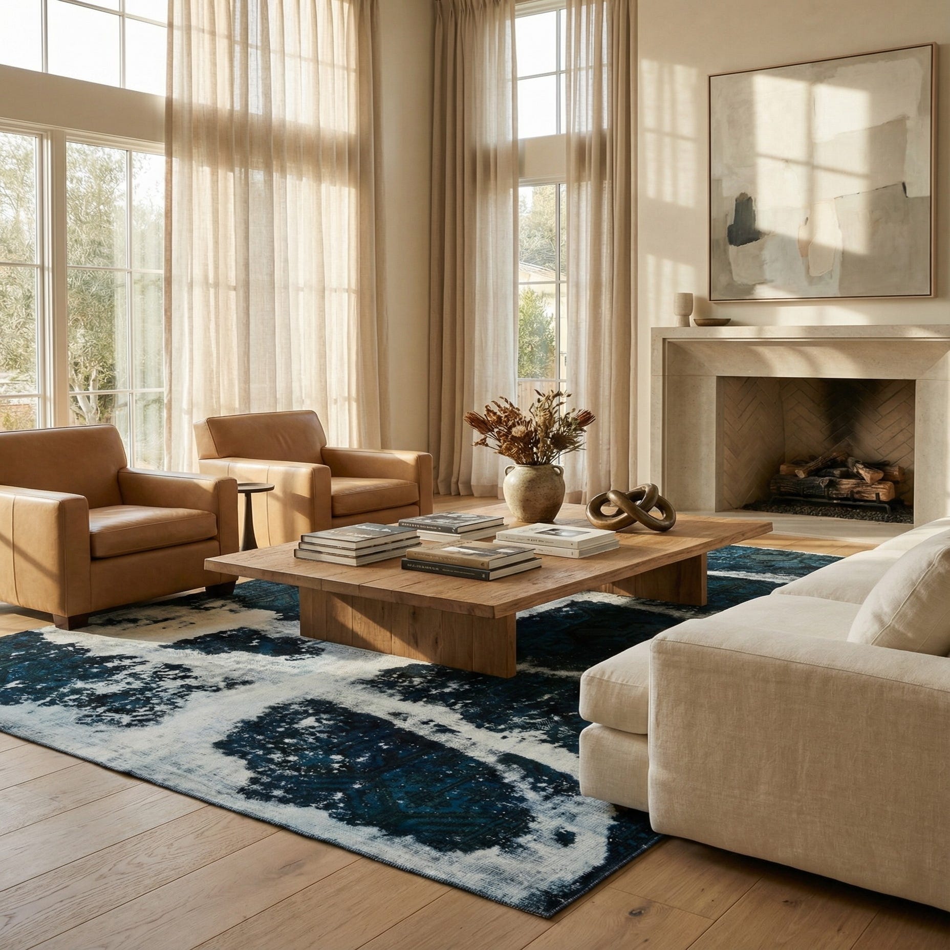 This piece works well in spaces that balance classic and modern elements—place it beneath a low-profile sofa and coffee table to anchor a living room, or layer it in a bedroom to introduce color and visual depth against neutral bedding. It also pairs nicely with mid-century wood furniture, metal accents in an industrial loft, or clean-lined contemporary seating where the rug’s pattern can act as a focal point. The blue background and ivory highlights make it easy to coordinate with a palette of grays, creams, and warm woods for a cohesive, intentional look.